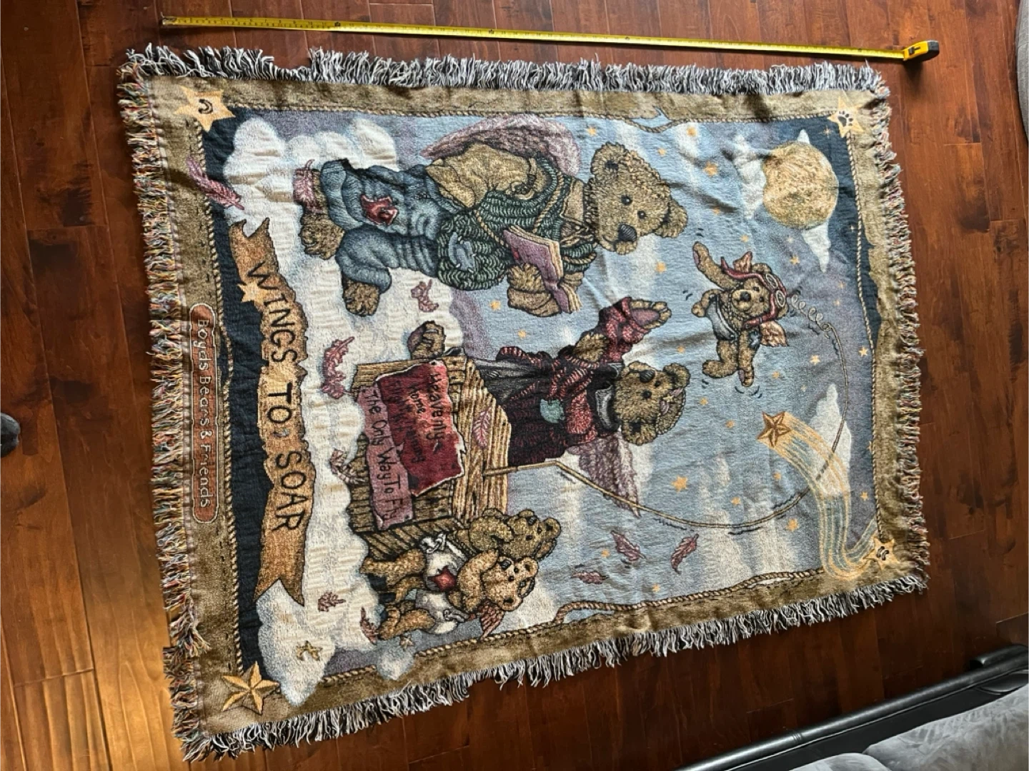 Selling a charming Boyds Bears & Friends woven tapestry throw blanket featuring a delightful design of teddy bears in flight! The blanket showcases the words "Wings to Soar" and is in great condition. Perfect for adding a touch of whimsy to any room!