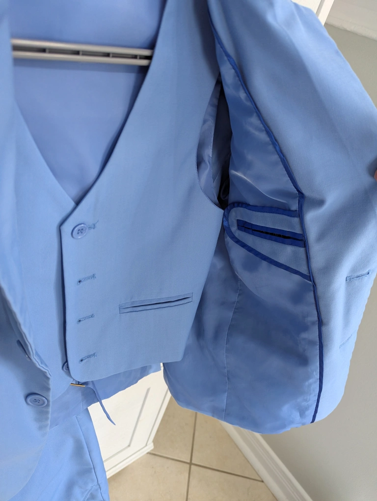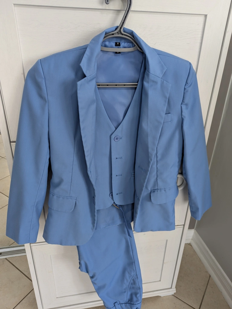 Selling a boys' blue suit in size 8. It includes a jacket, vest, and pants. Perfect for a special occasion! zipper needs fixing, cheap fix for tailor