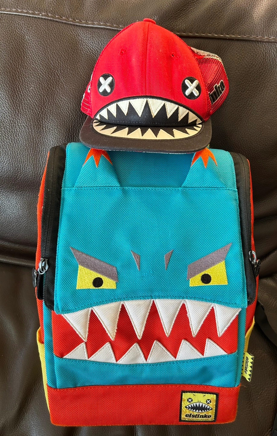 3 items for $10 Blue, red, and yellow monster backpack with a large mouth. Features a zippered pocket on the front and two adjustable straps and a hat