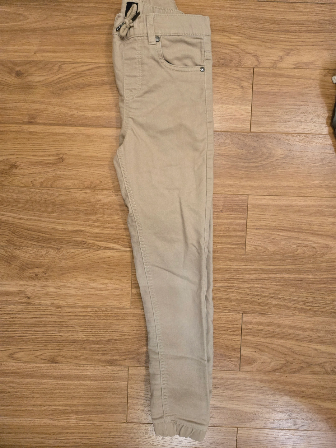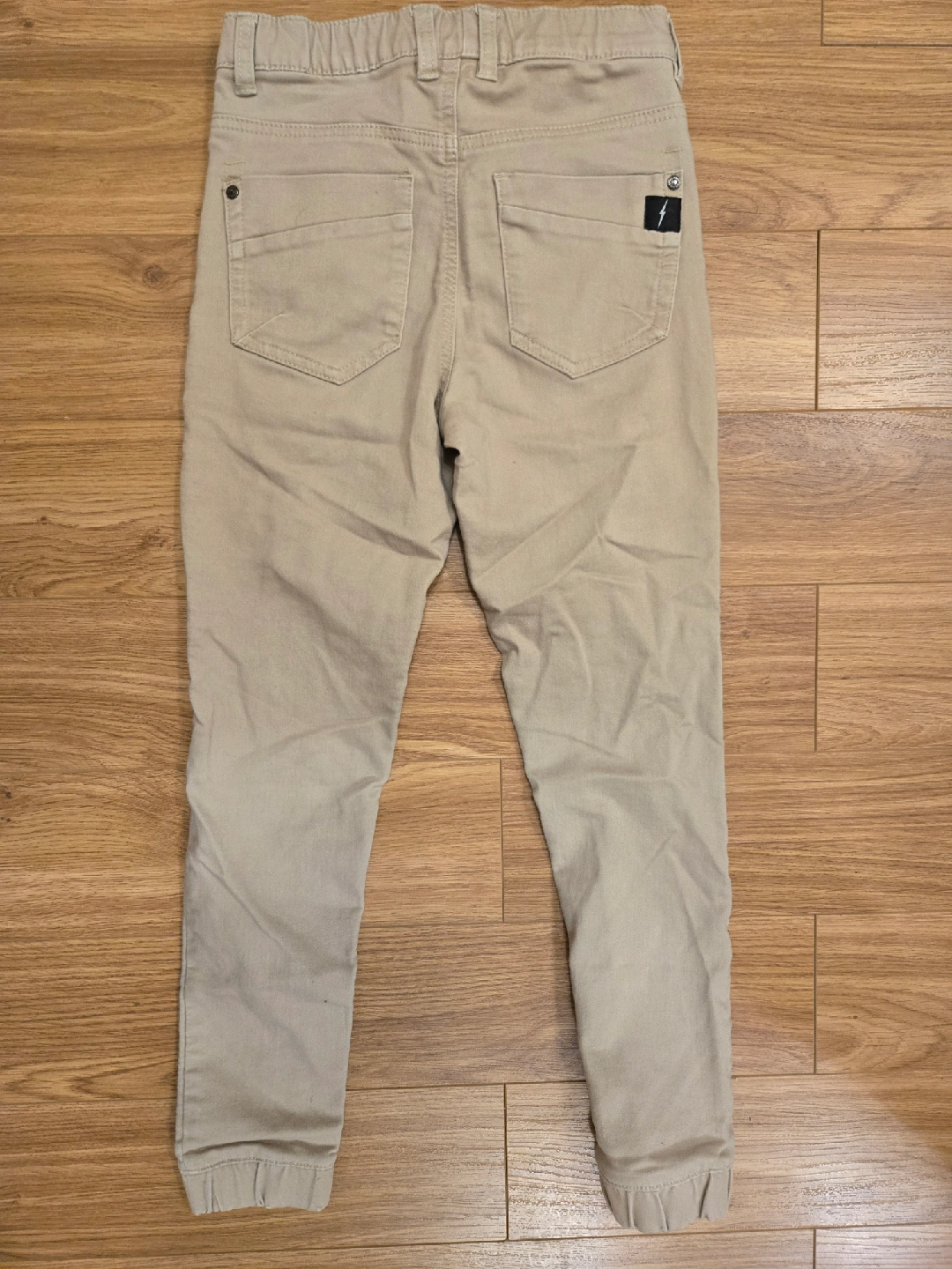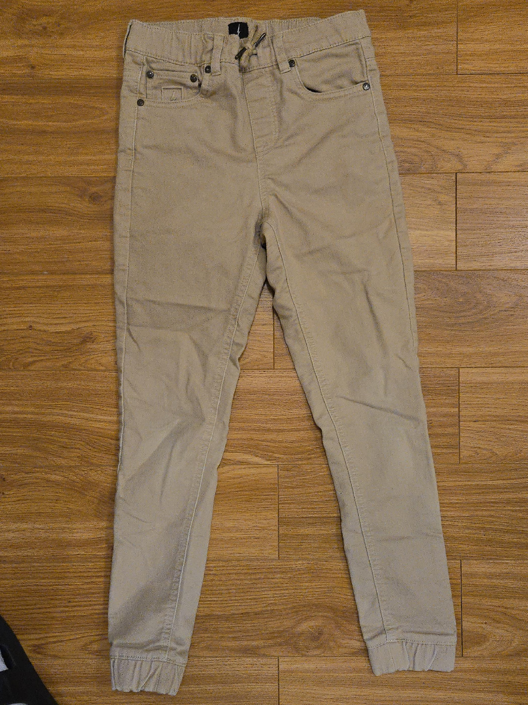 Selling a pair of boys' jogger pants in a neutral beige colour. They are size Medium Boys (10-12) and feature a comfortable elastic waistband with a drawstring. Perfect for everyday wear!