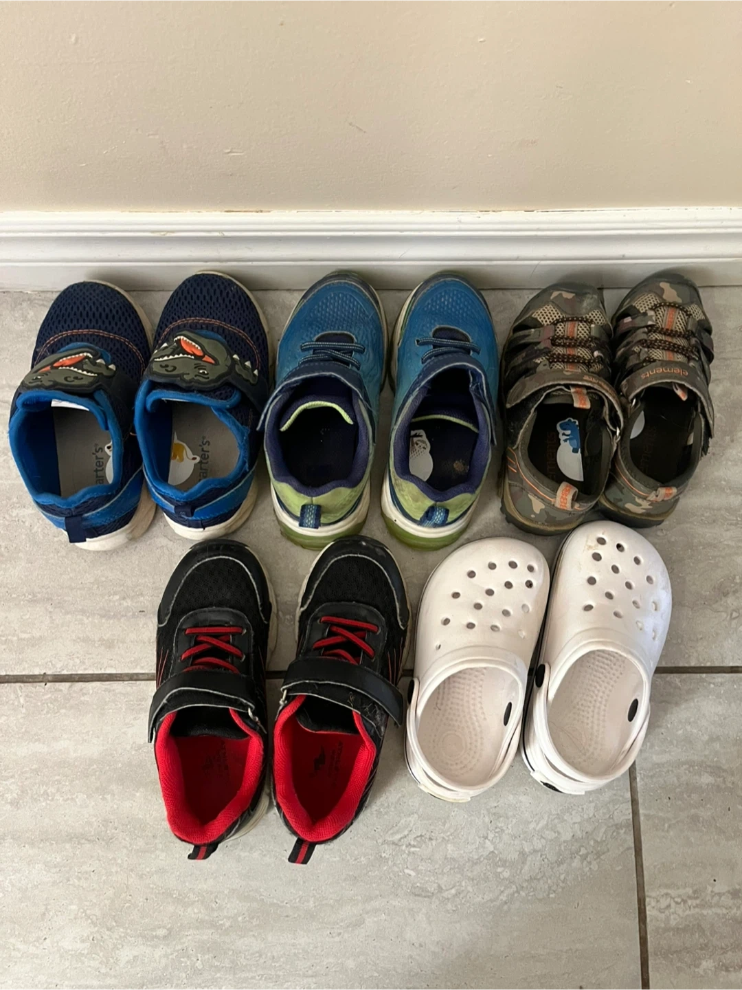 Running shoes, sandals and crocs (not crocs brand!). Sizes 10 and 11 Both blue pairs of running shoes light up. The sandals were barely used and the crocs were never worn. Smoke free pet friendly home Cash only Pick up near stone road mall