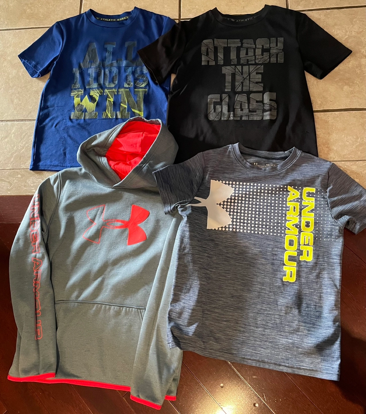 Boys activewear shirts in size, large (10/12) and extra large (12/14). Under Armour shirts are both XL. The other two shirts are L. Under Armour hoodie is $20. Under Armour t-shirt is $10. The other two t-shirts are $8 each. Buy all four shirts for $35.
