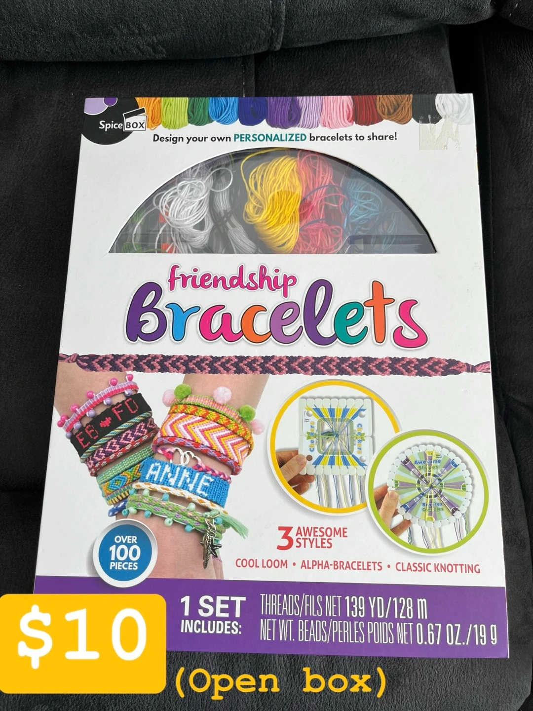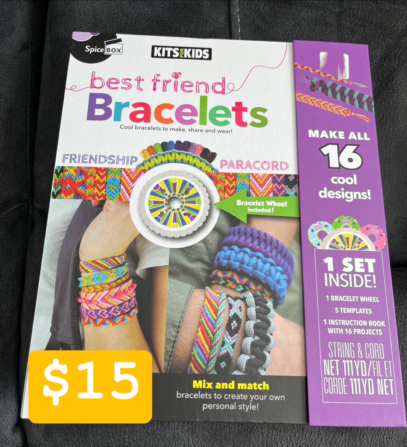 3 bracelet-making kits. LoopLoom Bracelets book includes handheld loom. Friendship Bracelets kit, open box, Best Friend Bracelets kit includes bracelet wheel and 16 designs. Take 2 new un open box for $25, take all for $33 Great for crafting!