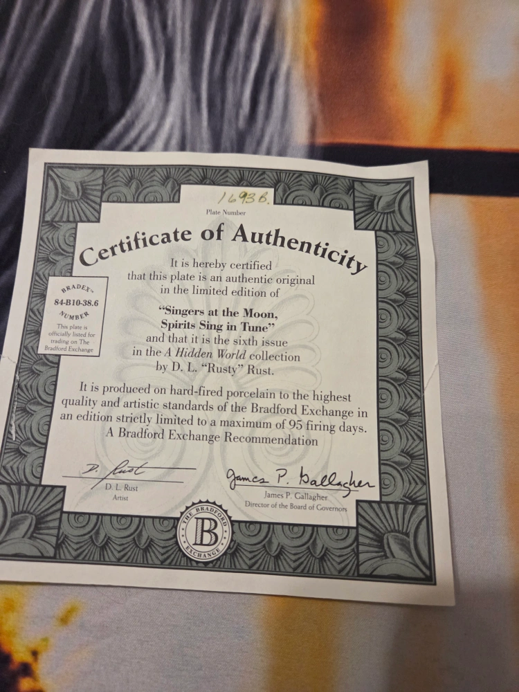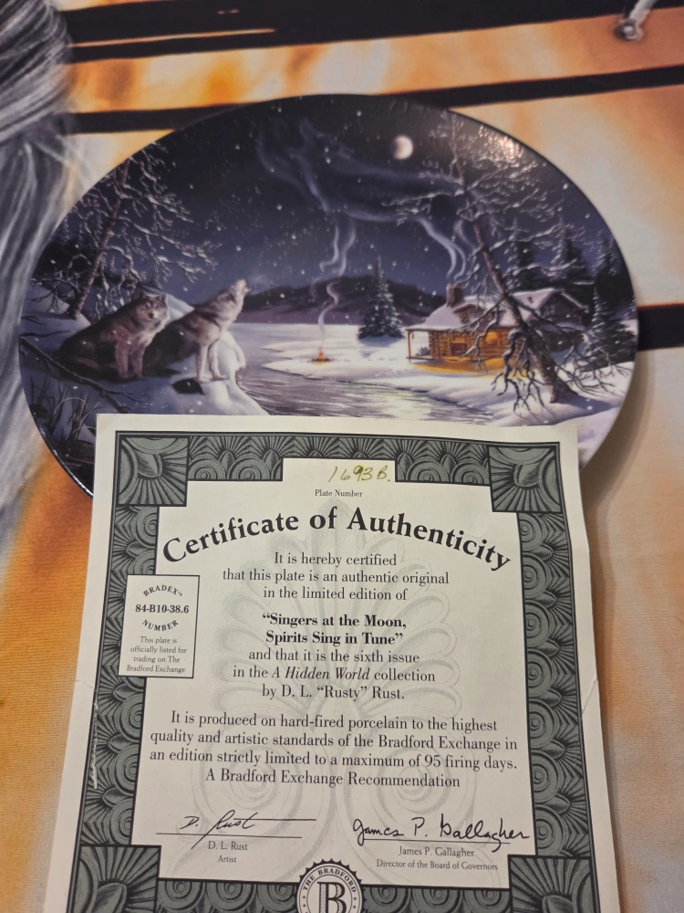 Selling a Bradford Exchange collector's plate titled 'Singers at the Moon, Spirits Sing in Tune'. It's the sixth issue in the A Hidden World collection by D.L. 'Rusty' Rust. This plate is produced on hard-fired porcelain and is limited to a maximum of 95 firing days.