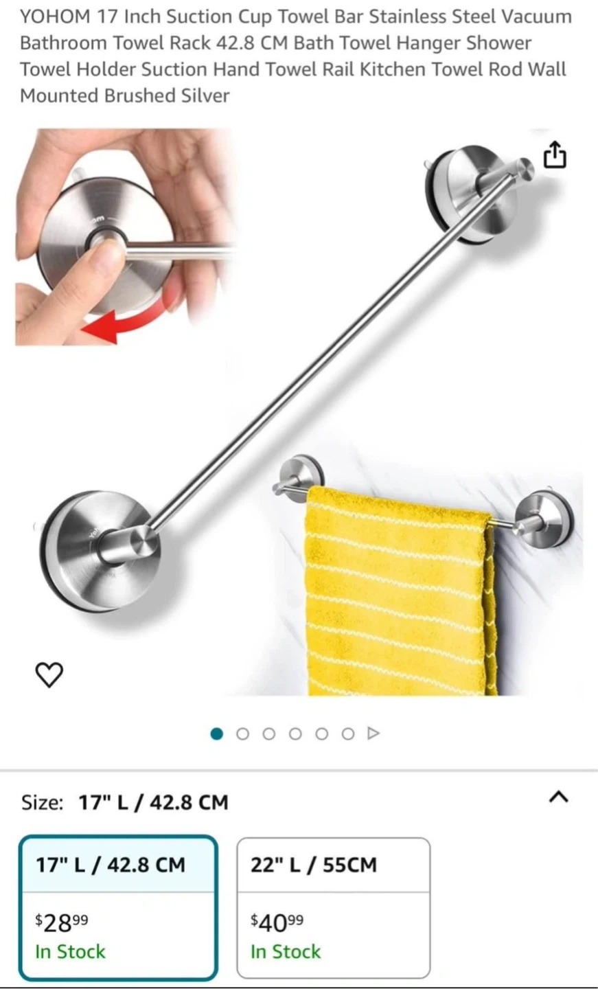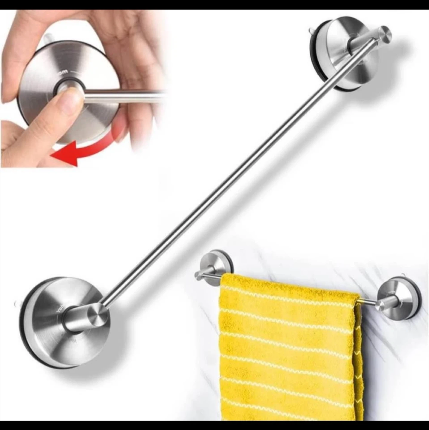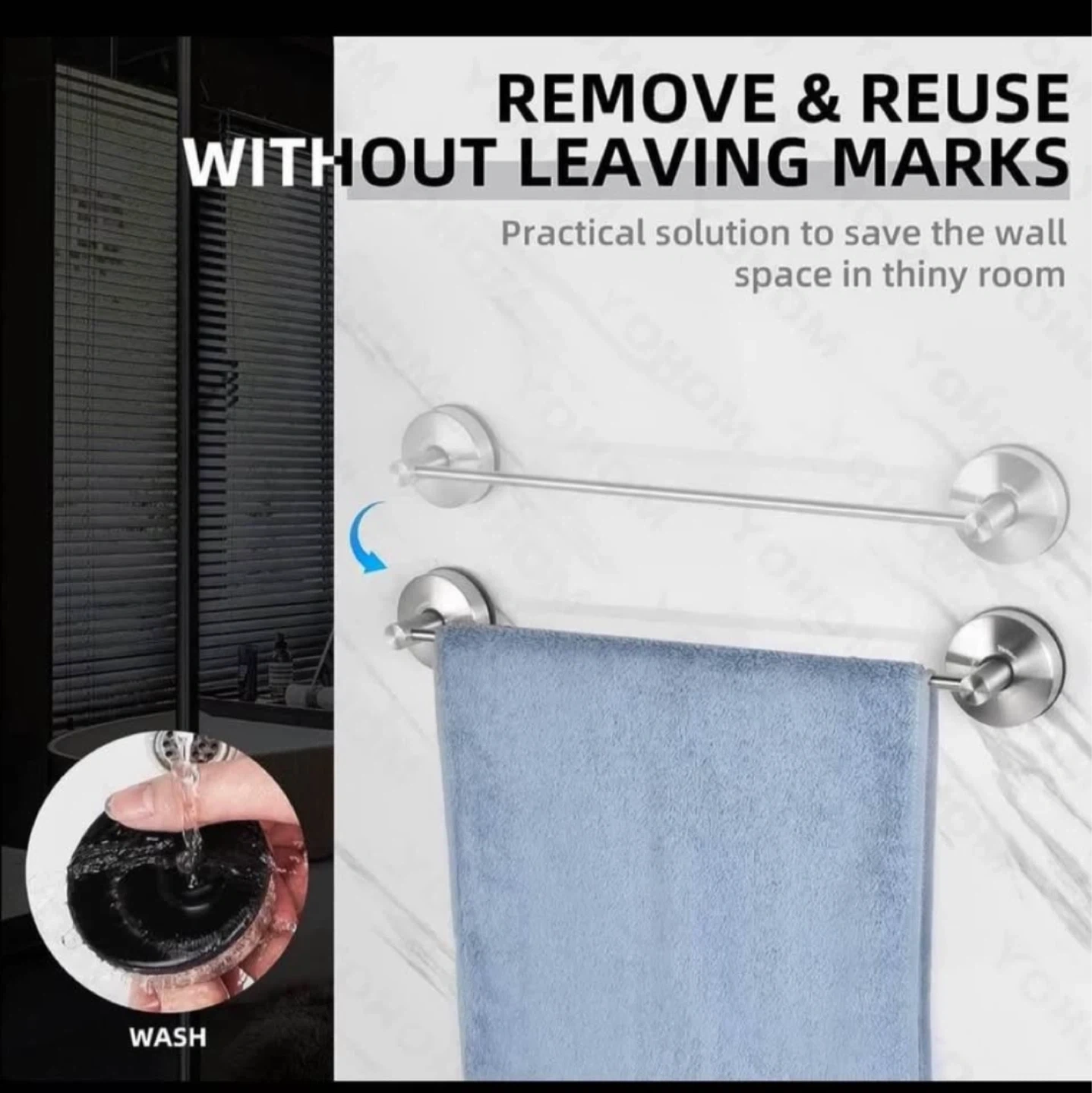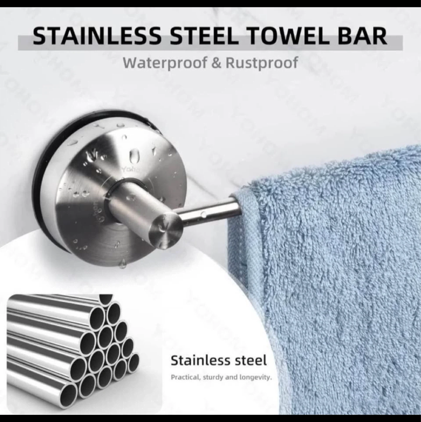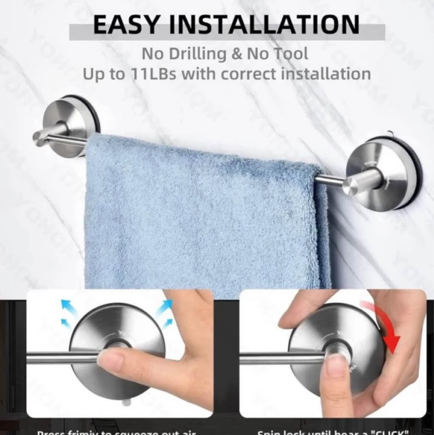 Looking to add a towel bar without drilling holes? This towel bar is made of stainless steel and is waterproof and rustproof. It suctions to the wall, so it's easy to install and remove without leaving marks. It's 17 inches / 42.8 cm long and can hold up to 11 lbs with correct installation.