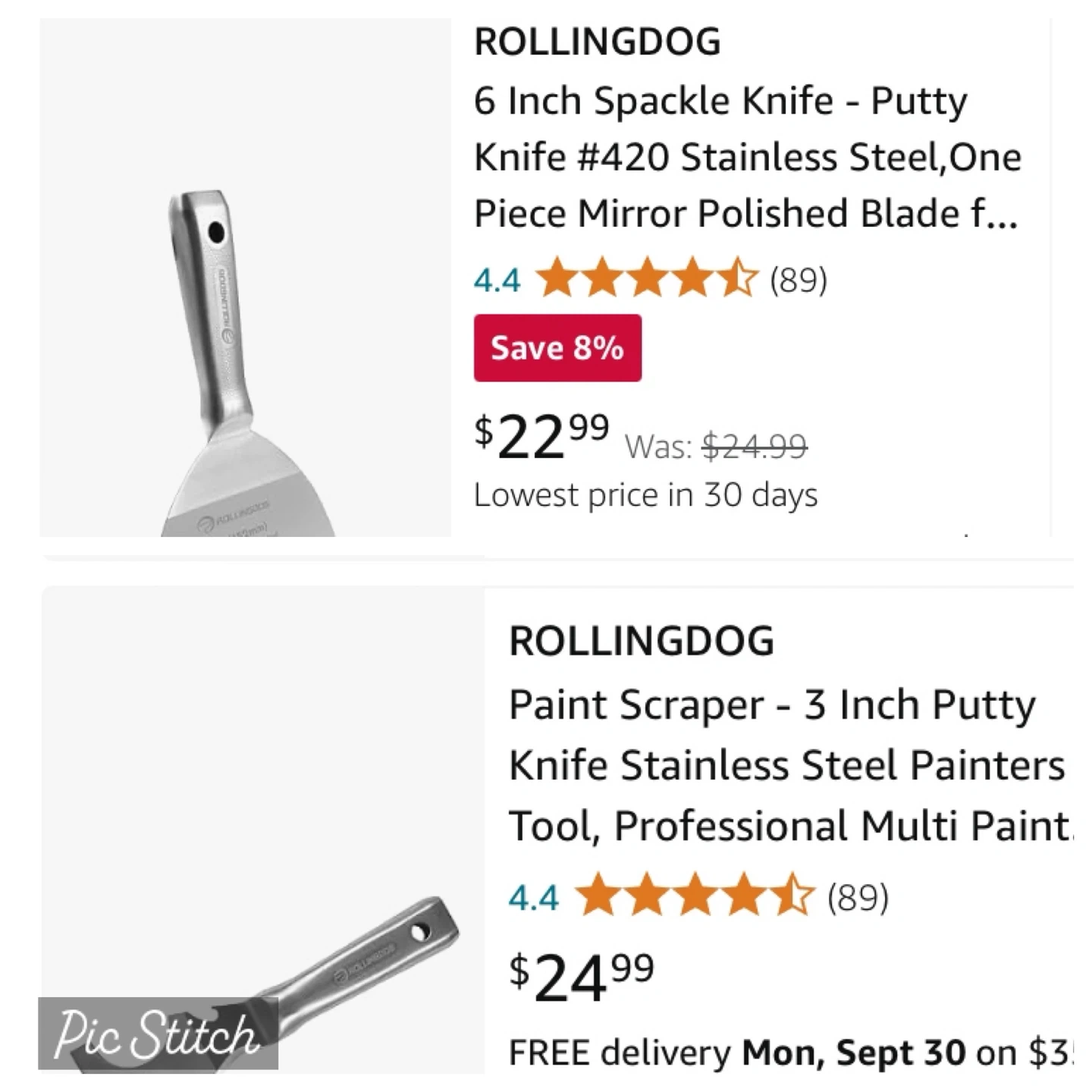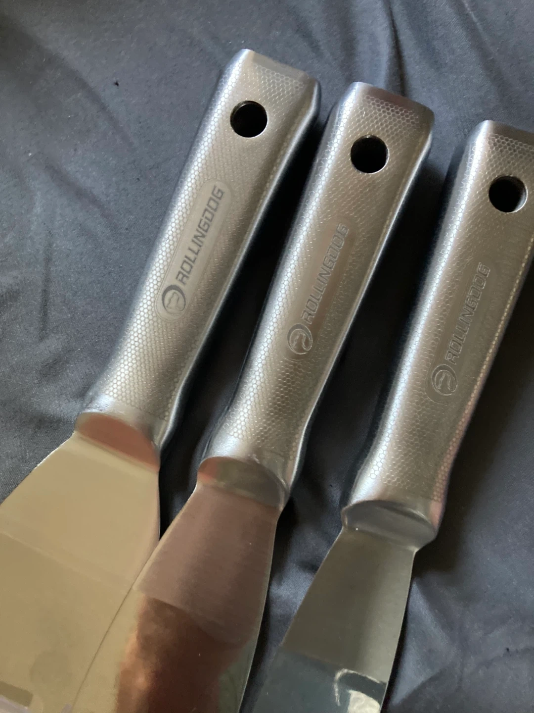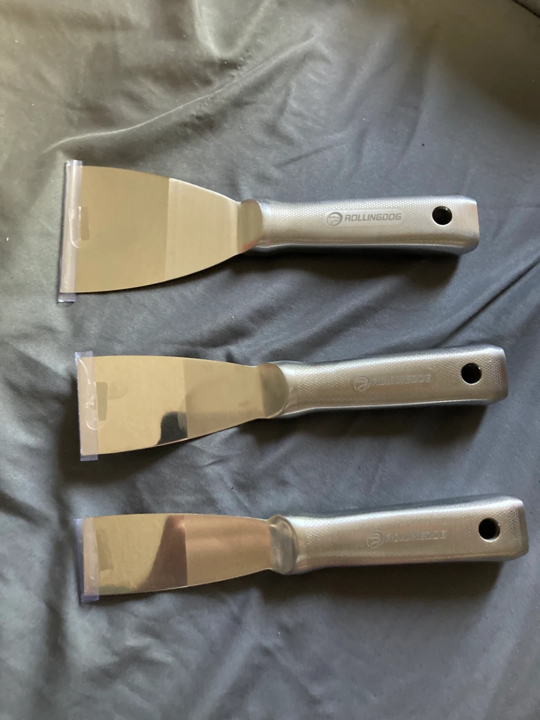 These are brand new and never been used at all 3pc stainless steel putty/scraping knives. There is 1-1/2” wide, 2” wide and 3” wide blades in these fully one piece, absolutely no joints or seams in these stainless steel tools. These are $25 each in store but I’m only asking $15 for all 3 I have several sets available