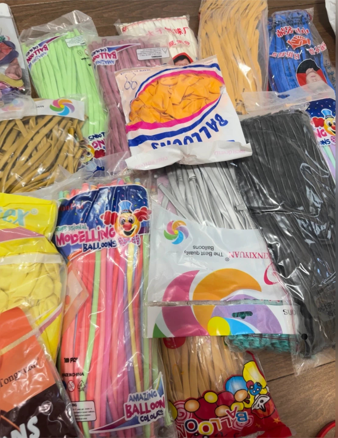 All Brand new balloons 65 packs in total (100 balloons per pack, some of them 150 gallons per pack) Round and long shapes Including all colors a bunch of large letter balloons for free