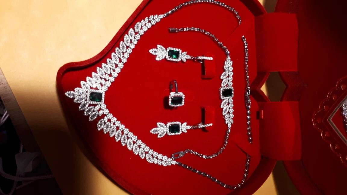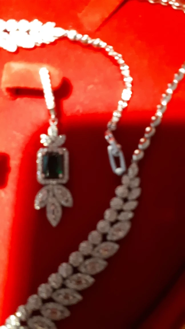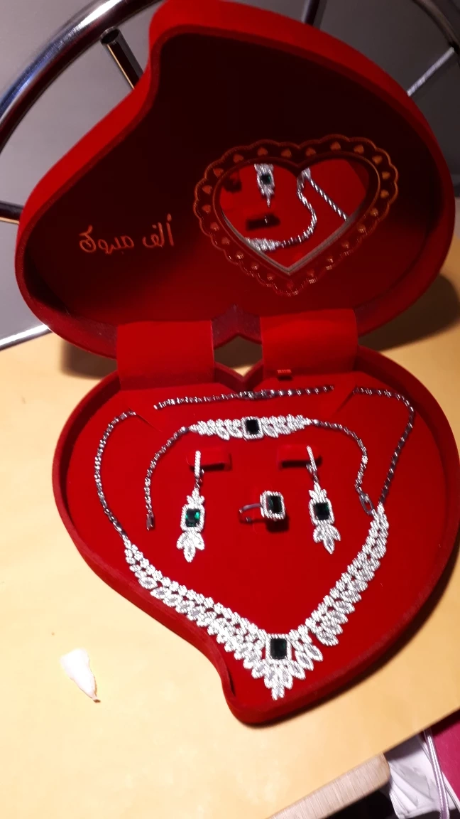 Stunning jewellery set. Features a necklace, earrings, bracelet and ring. Green emerald accents. Sparkling cubic zirconia stones. Comes in a heart-shaped box. silver stamped with 925 45 grams