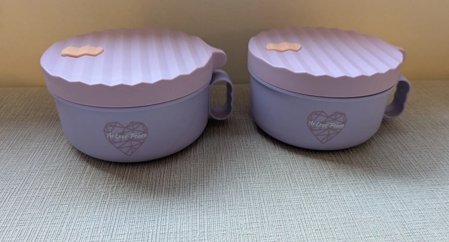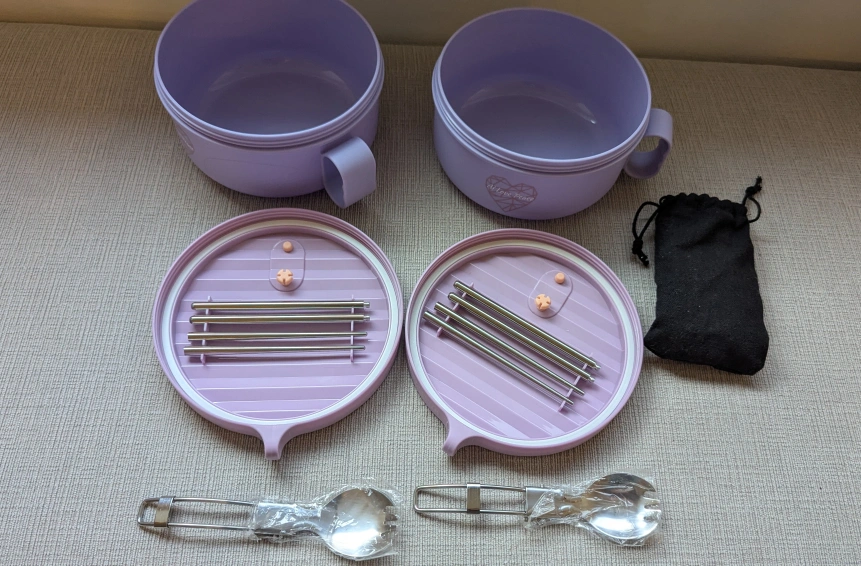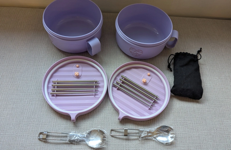 Two lavender bowls with lids and handles. Includes two sets of foldable cutlery: chopsticks and spoon/fork. Cutlery stored in matching compact cases. Black carrying pouch included. Perfect for travel or lunch.