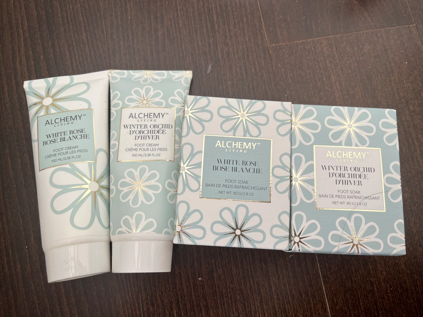 Treat your feet with this lovely set from Alchemy Living! Includes: - White Rose Rose Blanche Foot Cream (100 ml) - Winter Orchid D'Orchidée D'Hiver Foot Cream (100 ml) - White Rose Rose Blanche Foot Soak (80 g) - Winter Orchid D'Orchidée D'Hiver Foot Soak (80 g) It’s brand new. 2 foot cream & 2 foot soak for $12 only!!