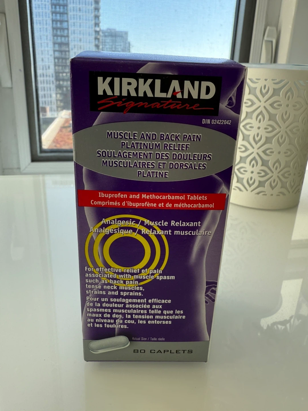Selling a box of Kirkland Signature Muscle and Back Pain Platinum Relief caplets. Each box contains 80 caplets. Expiry date is 2028. Great for muscle spasms, tense neck muscles, strains, and sprains