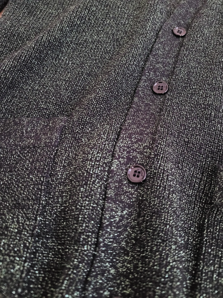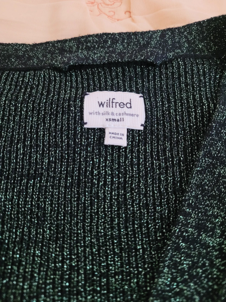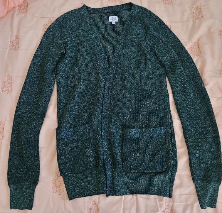 Green sparkly cardigan with pockets. Size XS. Silk + cashmere. Never worn, the tag with the extra silk and button is still attached. No deliveries, pickup only.