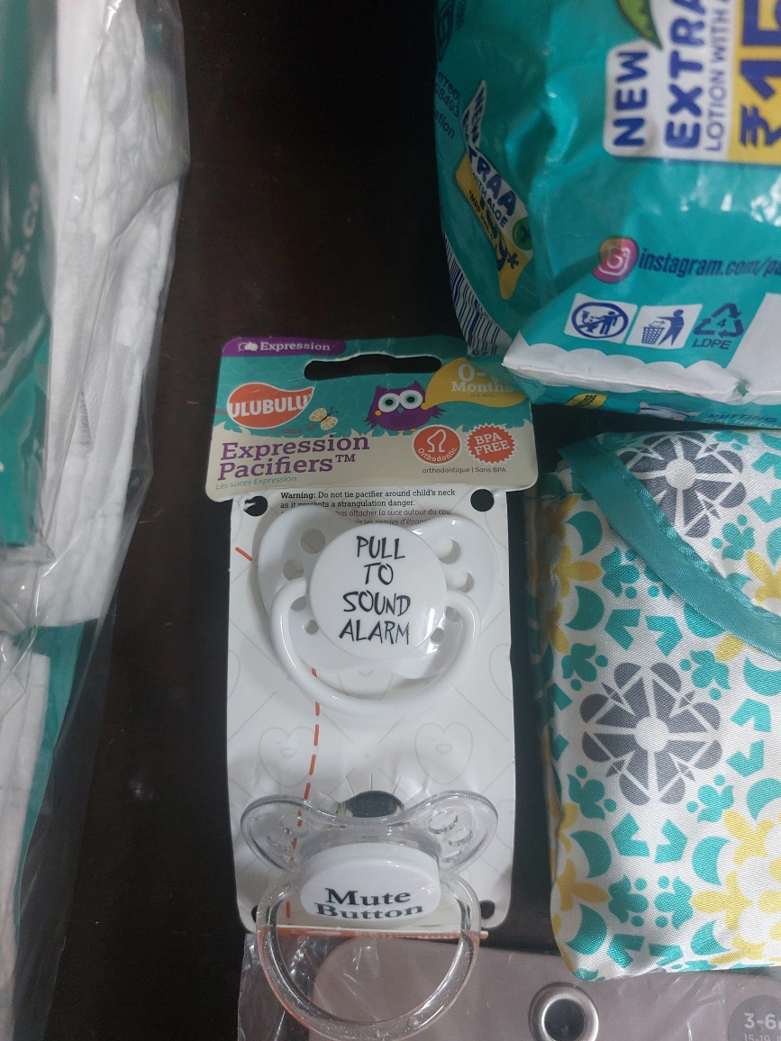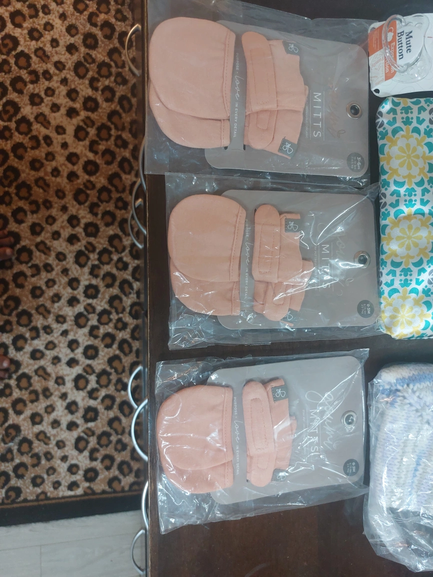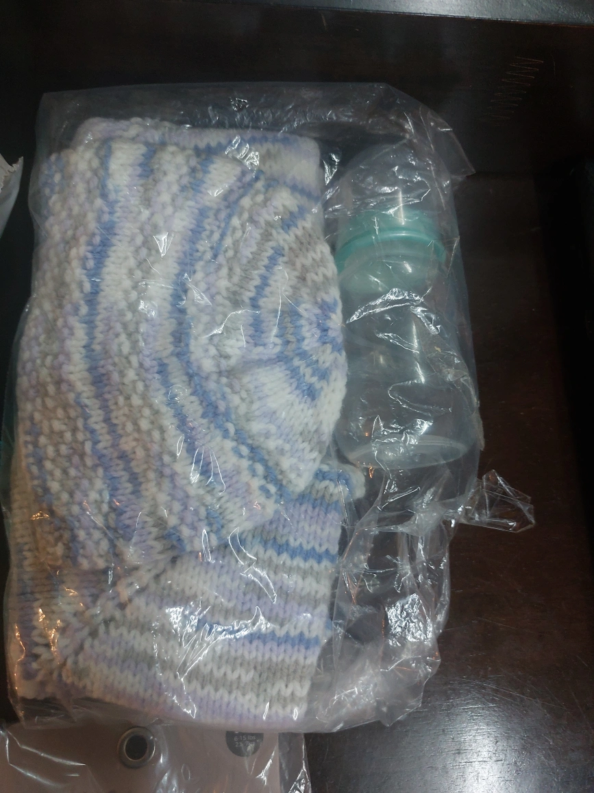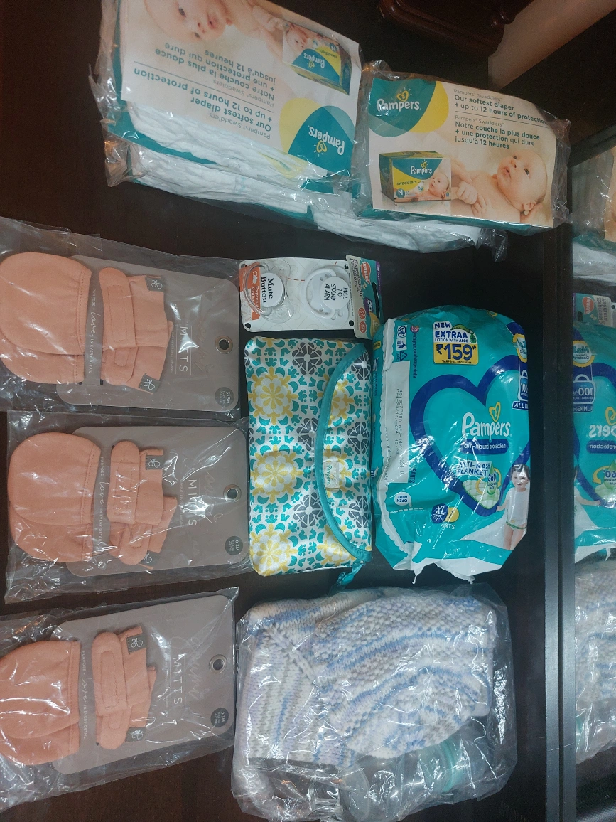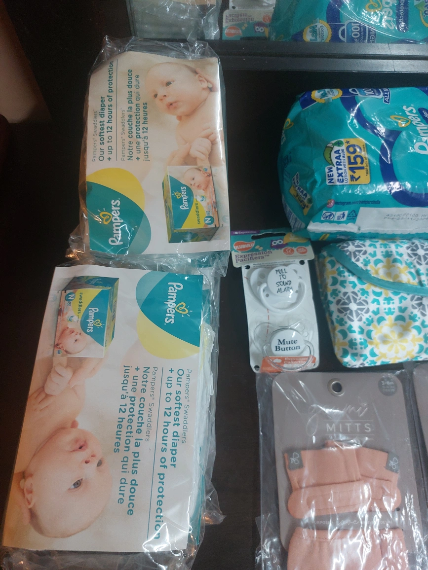 Brand new baby items 0 to 3 months including Mitts, Pacifier, knitted cap with scarf feeding bottle, Diaper purse with diaper, and diapers