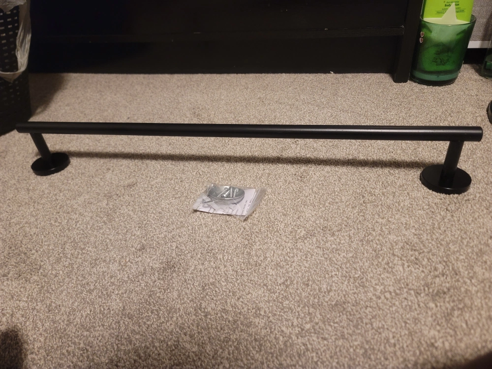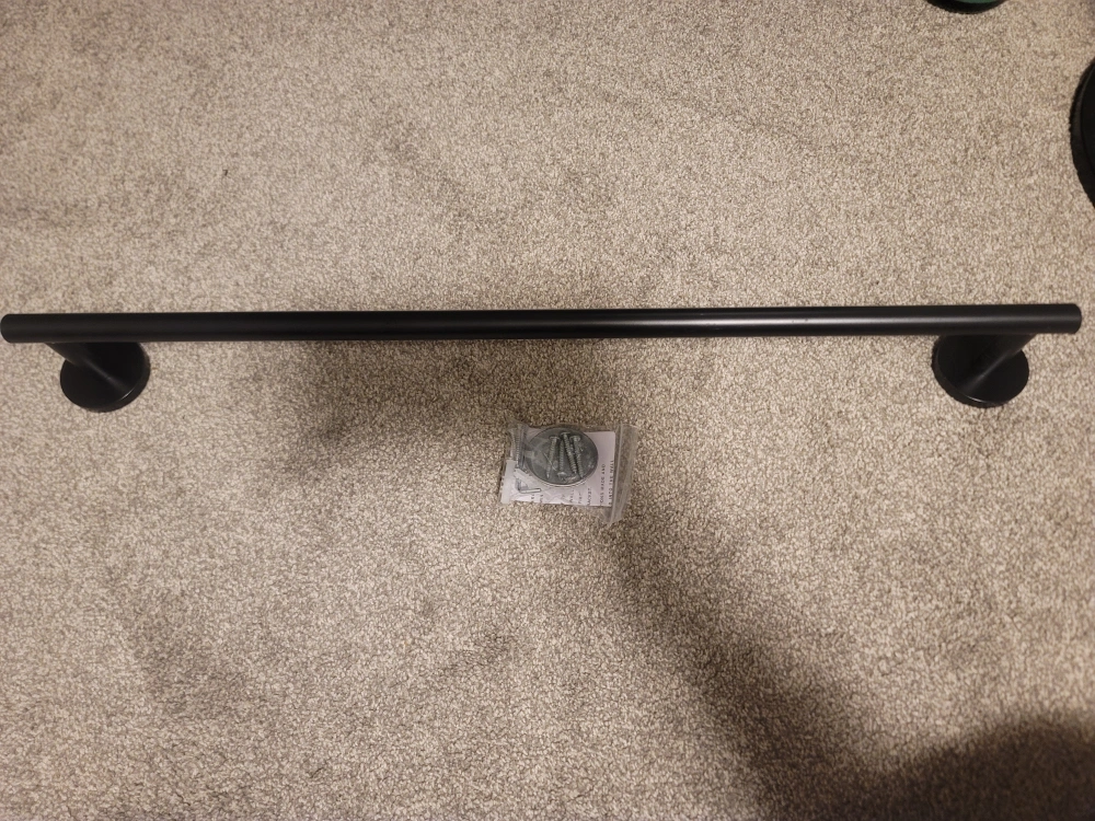 Selling a brand new black towel bar! my partner threw out the receipt and packaging before realizing it wouldn't fit in our bathroom. Has all the necessary components including instructions. It will look great in any bathroom! 24", not including the ends and circular mounts.