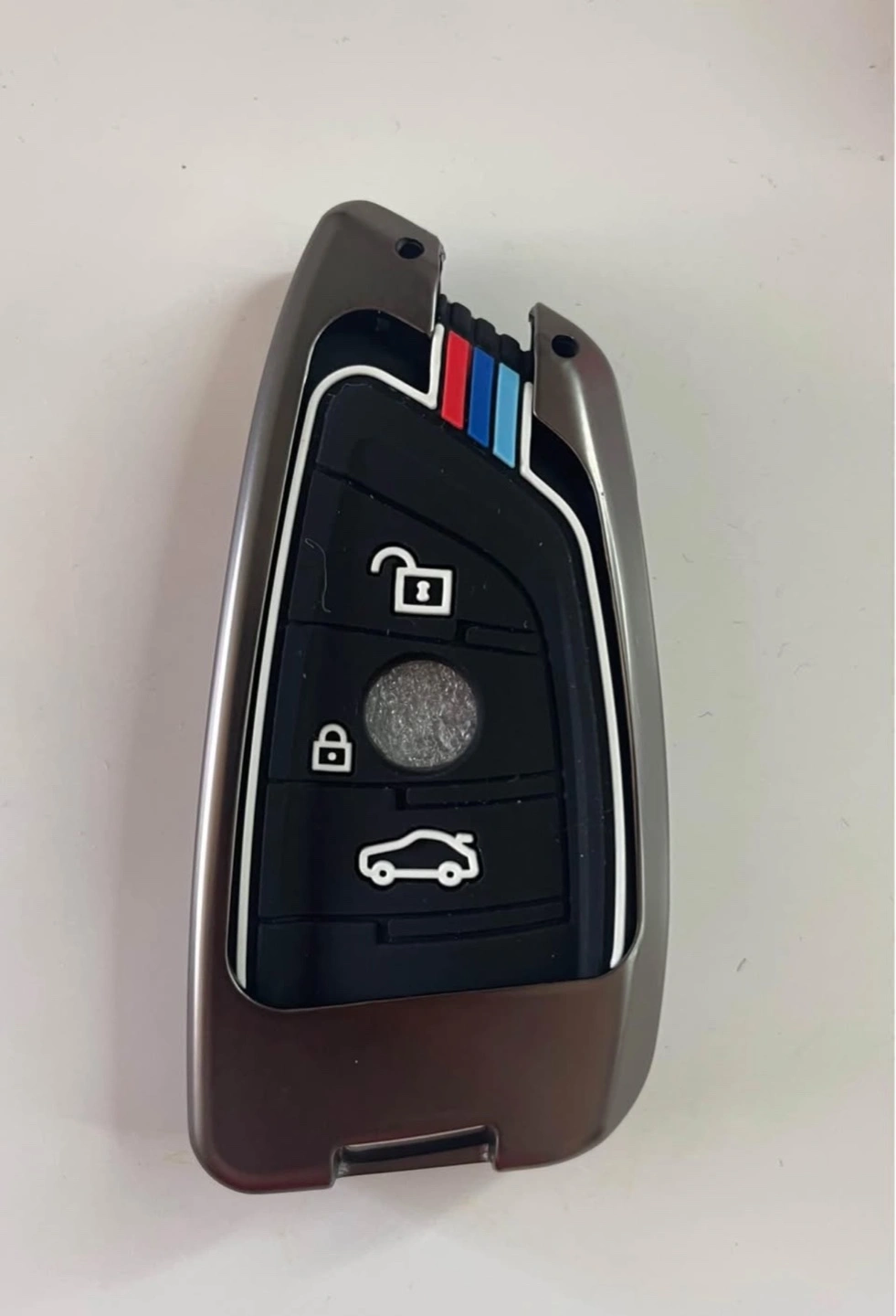 Dark coloured key fob cover. Has a series of buttons. The back has three stripes, red, blue, and white. Such an item is a pleasure to use.