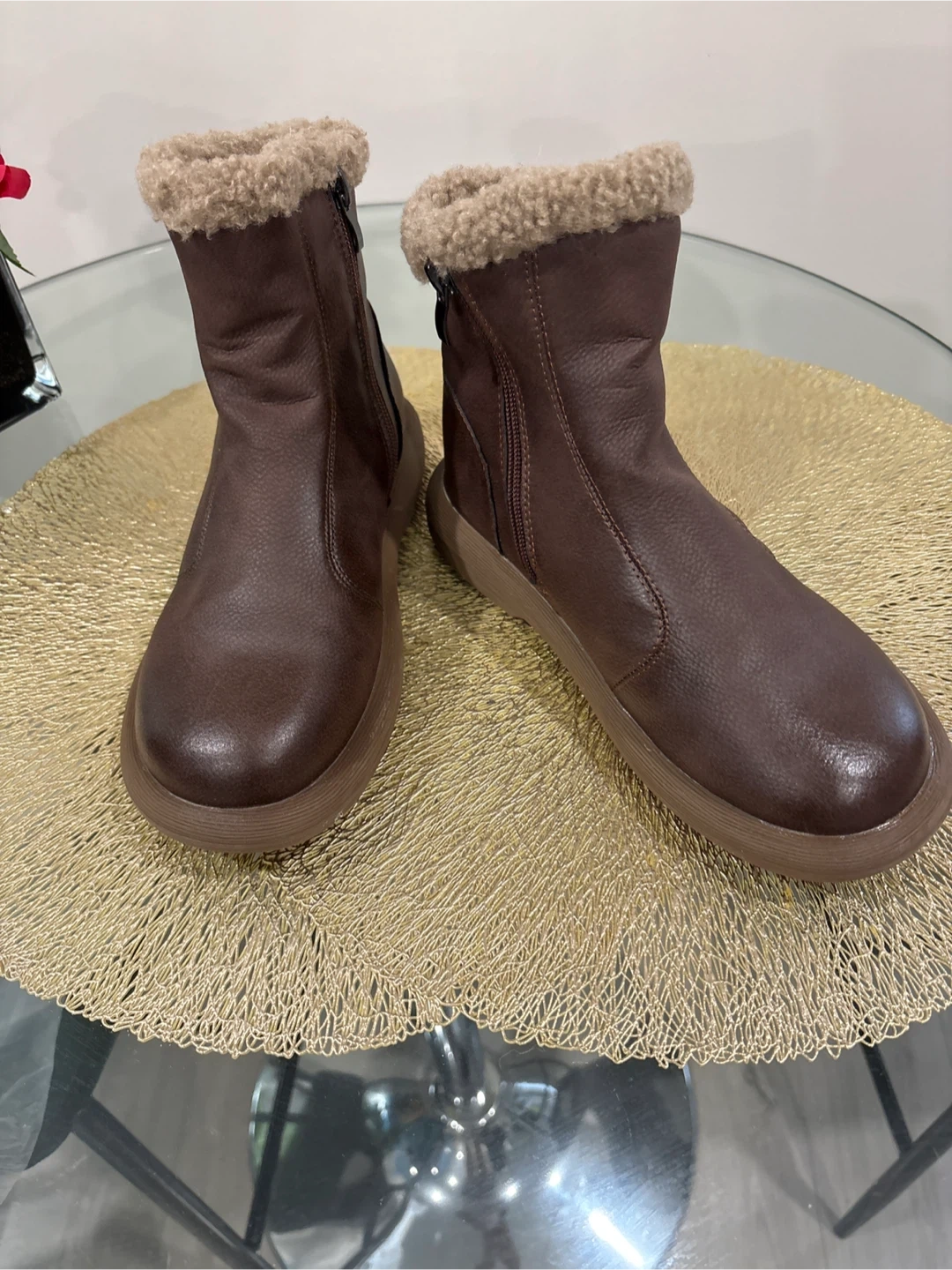 Brand New Cozy up this winter with these stylish brown boots! They feature a soft faux fur lining to keep your feet warm and comfortable. The leather exterior is durable and looks great, perfect for everyday wear. $28