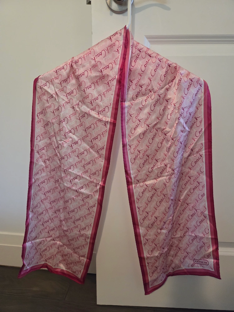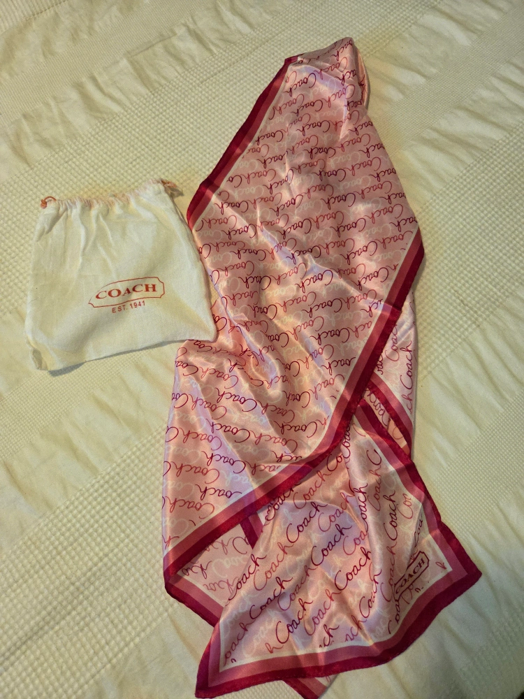 Selling a lovely Coach scarf in a signature pink print! It comes with its original dust bag too. The scarf features the Coach logo throughout the design and has a nice, soft feel. 100% silk. Never worn. Perfect for adding a touch of style to any outfit!