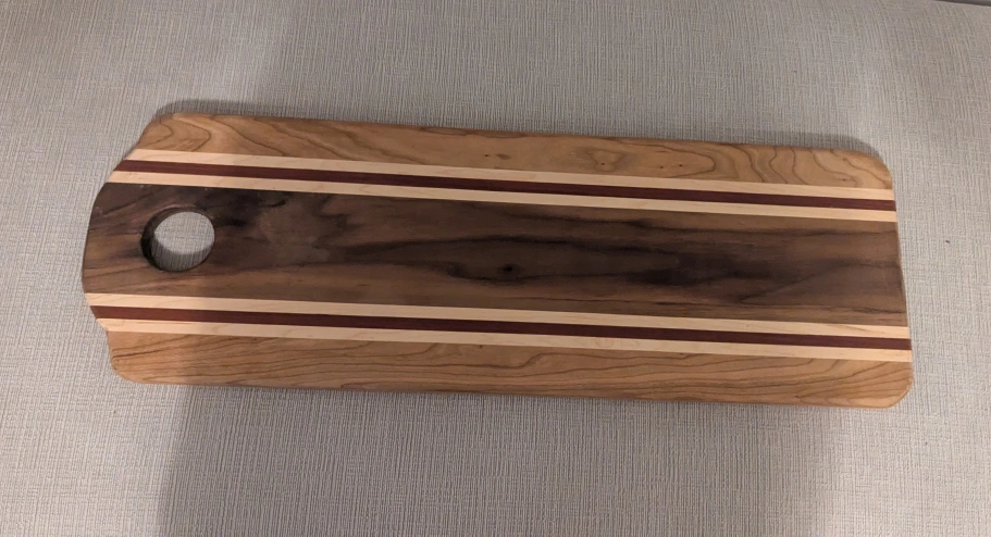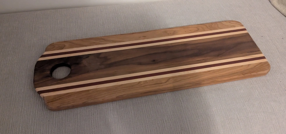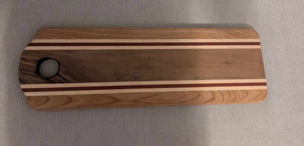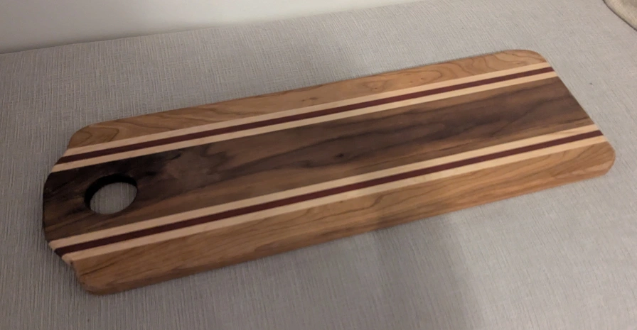 Beautiful handcrafted serving board. Features walnut and maple wood. Includes finger hole. Perfect for cheese, charcuterie, or appetizers. Dimensions are 24 inches by 8 inches, less than an inch thick.
