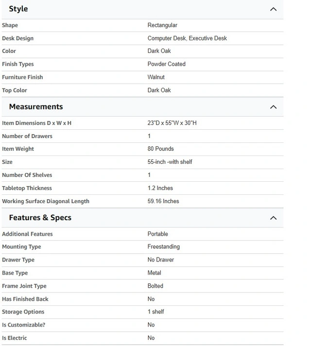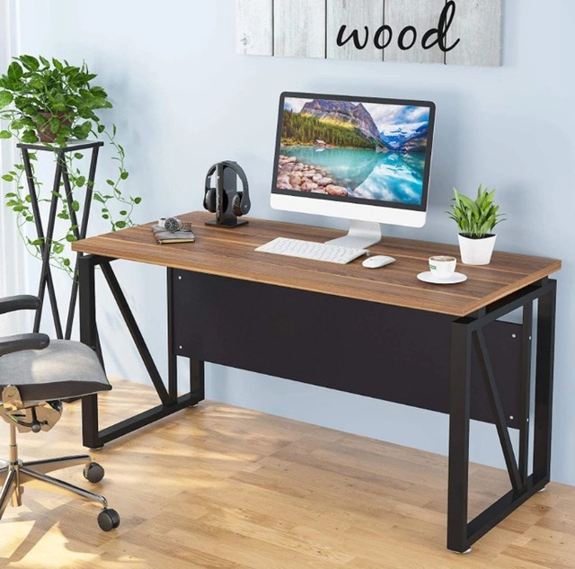 This brand new dark oak computer desk features a robust metal frame and a spacious 55-inch desktop, perfect for any home office setup. The desk includes a convenient shelf for extra storage and a powder-coated walnut finish for added durability and style. Its dimensions are 23" D x 55" W x 30" H. The desk can be easily assembled and is ready to enhance your workspace. Condition: New For Sale By: Owner Cash accepted Cashless payment