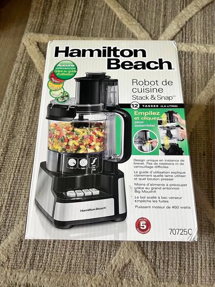Brand New Hamilton Beach 70725 12-Cup Stack and Snap Food Processor Powerful 450 Watt Easy stack & snap assembly Unique design requires no difficult twisting & locking Simple function guide shows you which blade to use & which button to press Big Mouth feed tube reduces pre-cutting