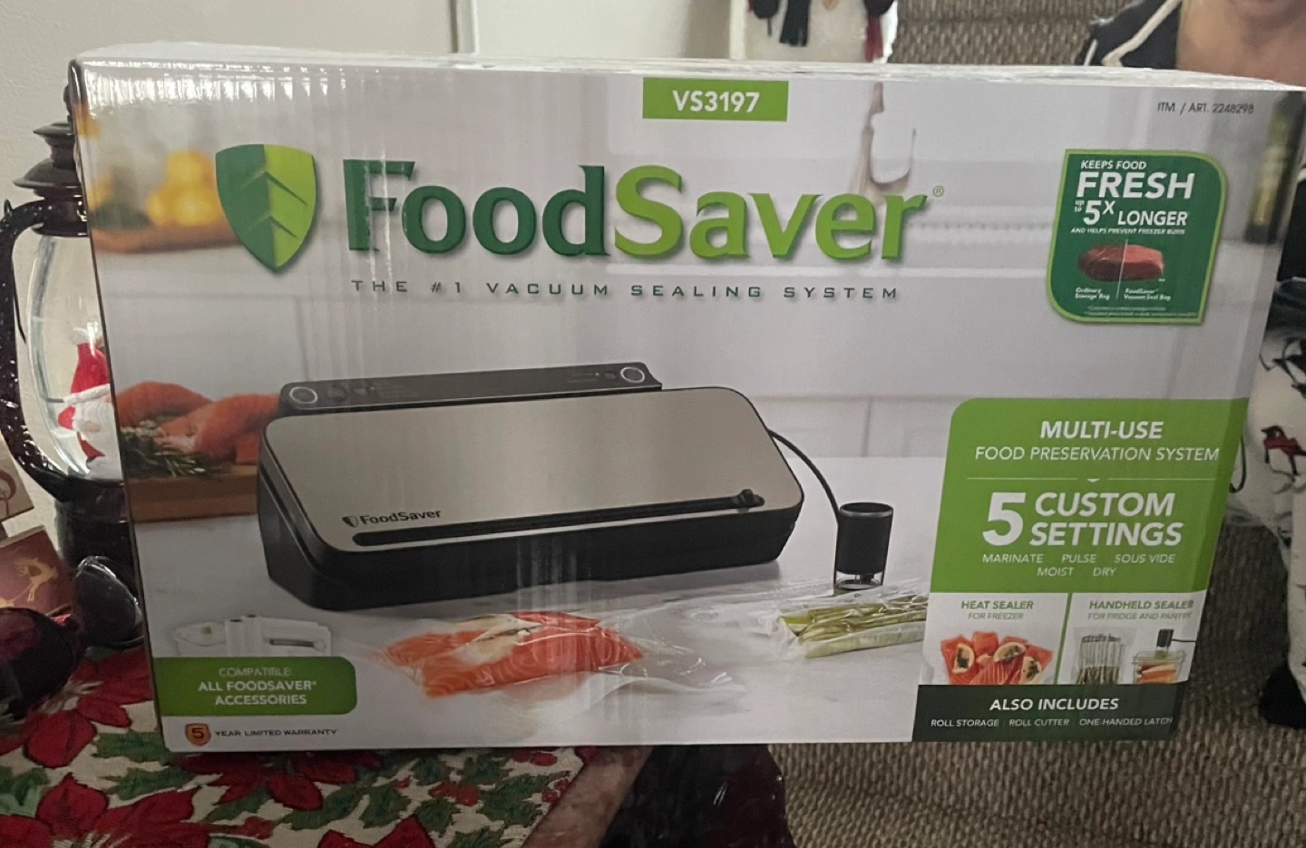 GREAT GIFT IDEA!!! Brand New Sealed In The Box KEEP FOOD FRESH LONGER: This FoodSaver Multi-Use Preservation System keeps food fresh in the freezer up to 5X longer, and fresher longer in the fridge and pantry, compared to ordinary storage methods-and helps prevent freezer burn as well • VERSATILE: Combines heat sealer and a built- in handheld vacuum sealer in one unit; use the heat seal strip for freezer storage, and the handheld sealer for fridge and pantry storage * MOIST AND DRY CUSTOM SETTINGS: This unit is equipped with 2 custom settings—dry and moist— to ensure an airtight seal is achieved regardless of the type of food you're sealing * MORE FEATURES: Roll storage with built-in cutter bar so you can create custom-sized vacuum seal bags; time-saving features makes bags from rolls faster, by cutting your bag as you're sealing your next bag; alignment tool and angled opening ensure ideal bag placement; removable drip tray * EASY TO USE: Simply press vacuum button to remove air and seal, and LED light indicates sealing is complete * INCLUDES: one Vacuum Sealer, one 11" x 8' roll of bags and a lot of other size bags Amazon sells the exact product for $218.82 plus Tax