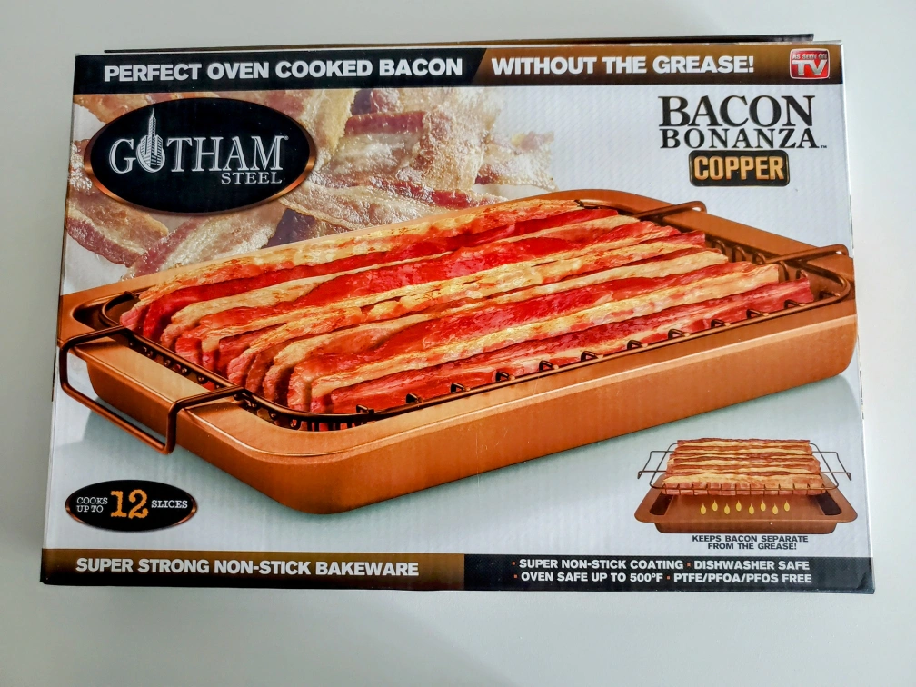 Copper baking pan with a wire rack. Perfect for cooking bacon without the grease. Cooks up to 12 slices. Super strong non-stick bakeware. Oven safe up to 500 degrees. Dishwasher safe. PFOA/PFOS free. Brand new and mint condition. Pick up anytime. I'm raising funds for a new wheelchair. Please see my other listings, thanks!