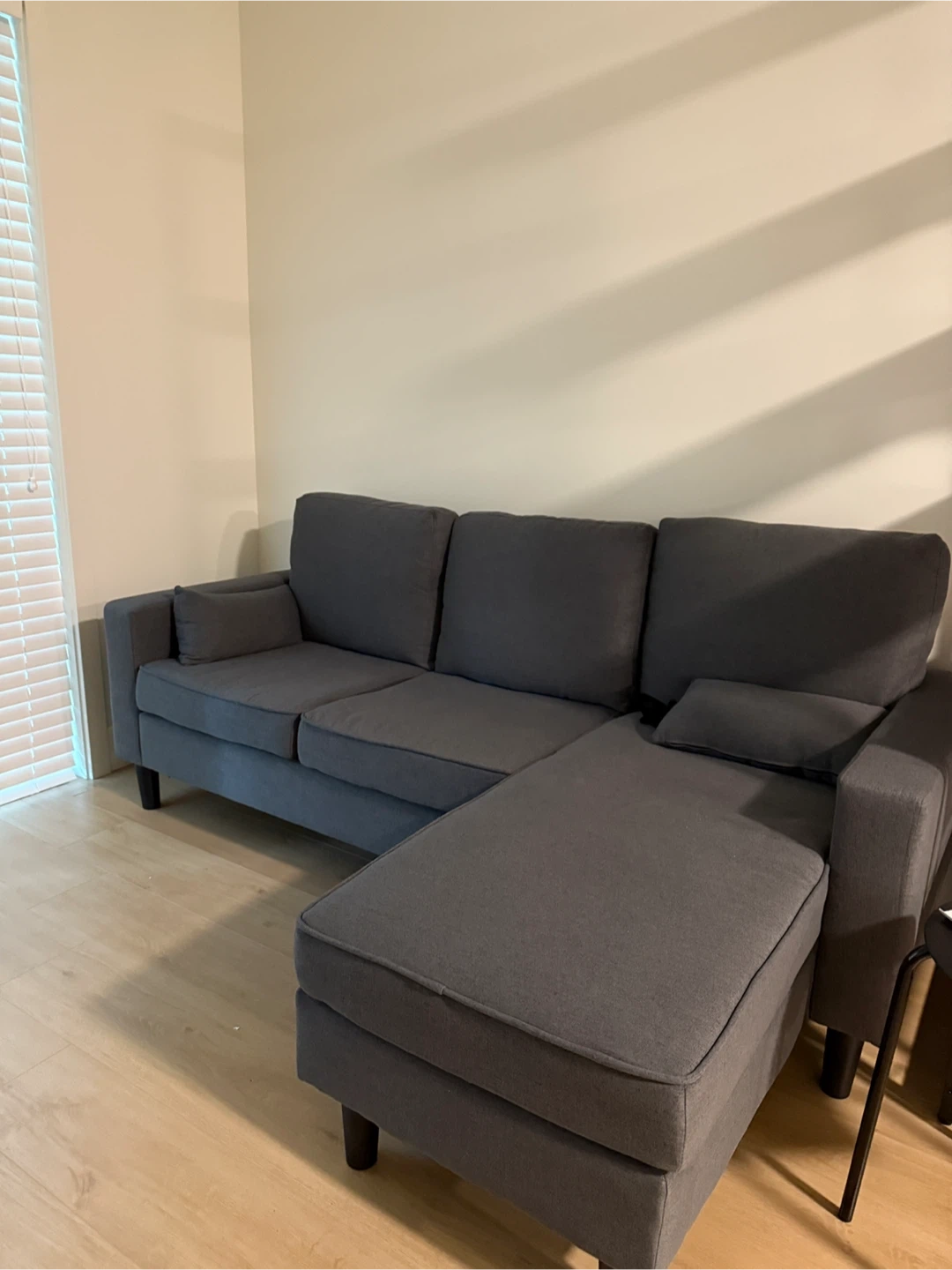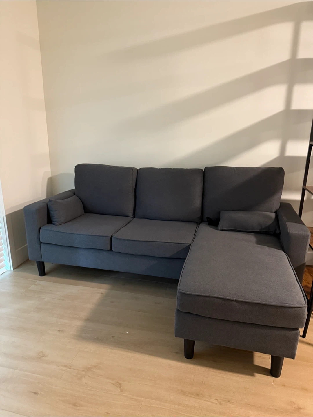 Selling brand new comfy grey sectional sofa! It features a chaise lounge for extra relaxation. Chaise can be switched to either side of the couch. Perfect for a living room or den.