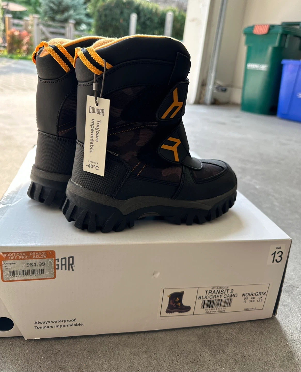 Brand new in box. Keep your little one warm this winter with these Cougar Transit 2 winter boots! These boots are size 13 and come in a stylish black/grey camo colour. They are waterproof and rated to -40°C, perfect for Canadian winters.