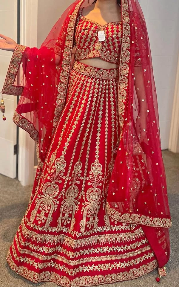 ✨ Never Worn Indian Bridal Lengha ✨ Beautiful, brand-new wedding Lengha purchased in July 2025 from a boutique in Jalandhar, India. My sister ultimately chose to wear our mother’s wedding outfit instead, so this piece has never been worn — only tried on once. Originally purchased for $1,500, selling for $1,100. • Size: Small (with generous margin to alter to your custom fit) • Condition: Brand new • Color & Style: Traditional red with antique gold hang embroidery ✨ Serious inquiries only, please. Try-ons are welcome for buyers with genuine intent to purchase.