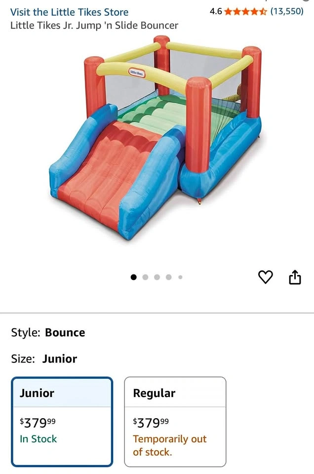 Approximately 10' x 7' x 5' total inflated size. Three mesh sides protect children, and let parents watch the fun. Stakes anchor the bouncer firmly in place, while a heavy-duty blower provides continuous airflow. Note: After inflation, blower must run continuously while children are playing. Built of puncture-resistant material. For outdoor home backyard use only. Pick up - Courtice