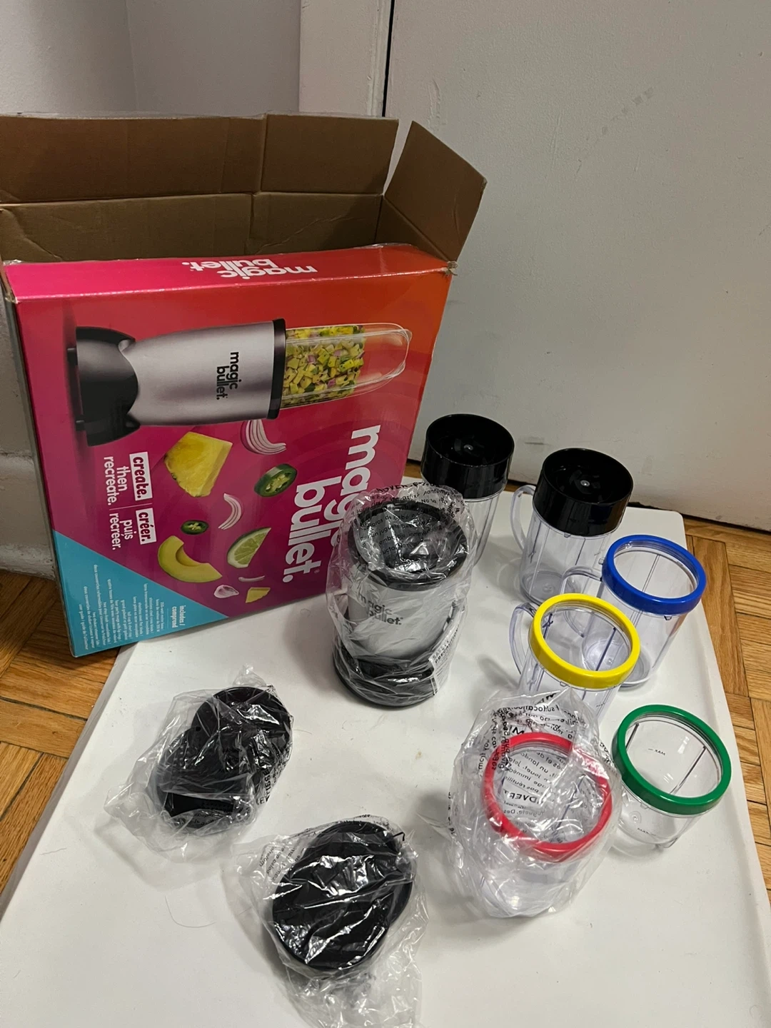 Selling a Magic Bullet blender set! It comes with all the accessories you see in the picture, including different sized cups and lids. The original box is included as well. Perfect for making smoothies or quick food prep! It's brand new, Box opened to display contents.