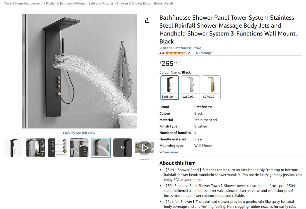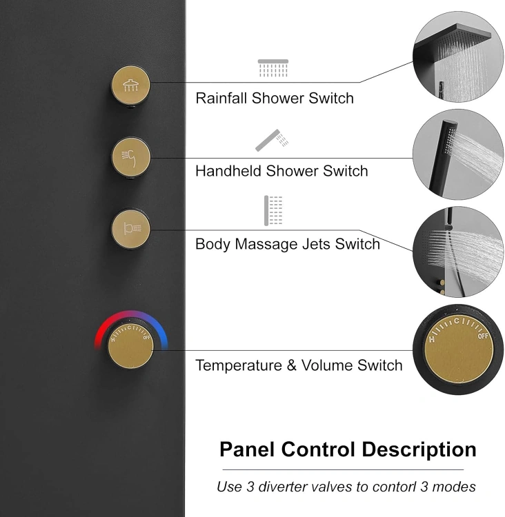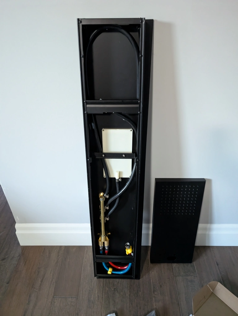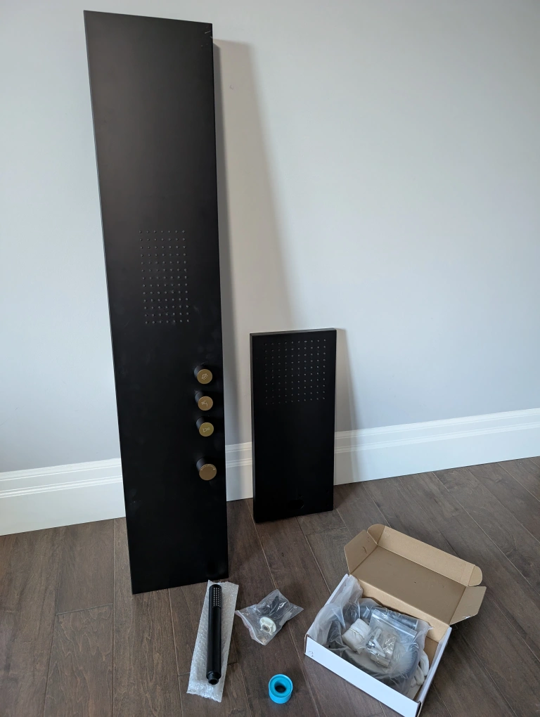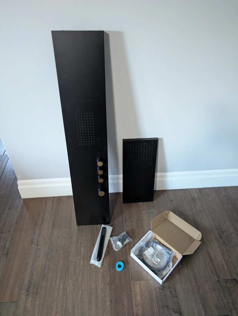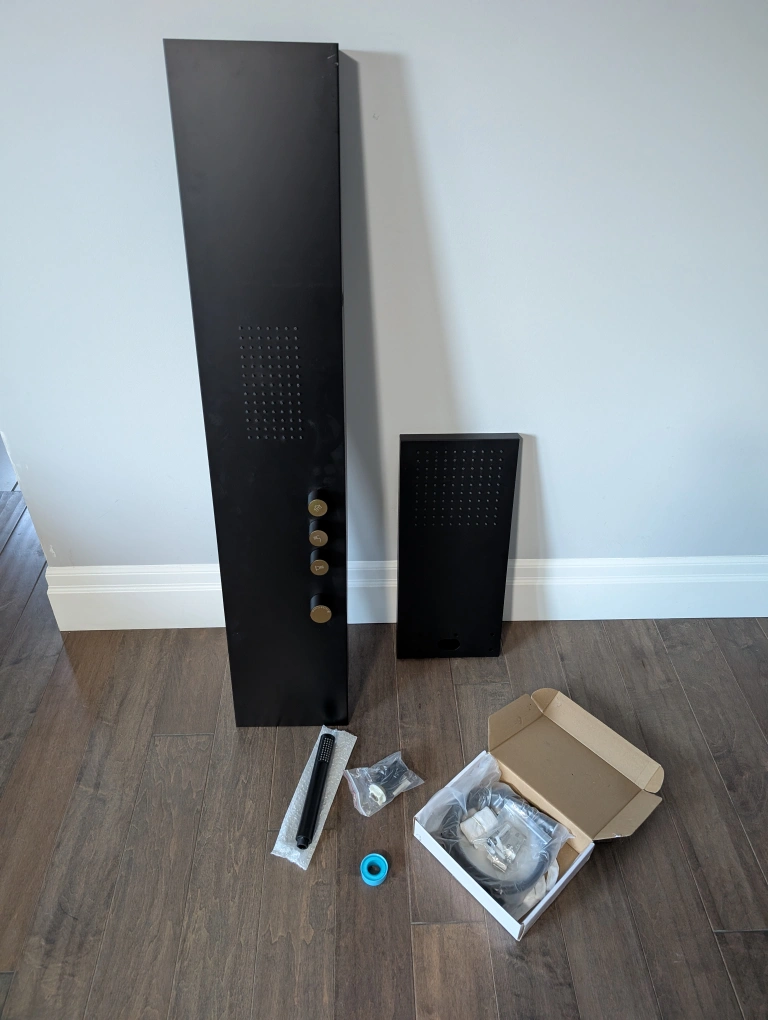Brand new Bathfinesse matte black shower panel tower for sale. Rainfall showerhead, waterfall, spray massage jets shower column, hand wand, column with mixer valve, stainless steel, 3 functions, wall mount, $100 FIRM. Shower, Bathroom, Bath, Tub, Reno, Bathtub, Water, Tower, Massage, Rainfall, Waterfall, Jets, LED, Lights, Column, Valve, Wand, Spray, Renovation, Temperature, Pressure, Balanced, kit, system, trim