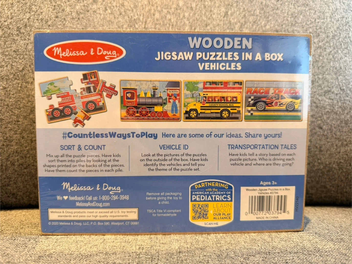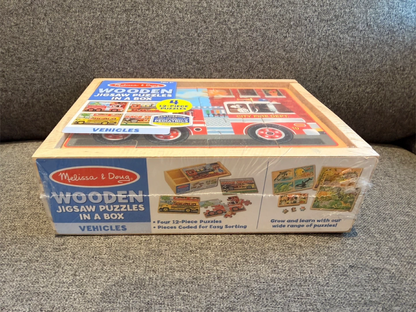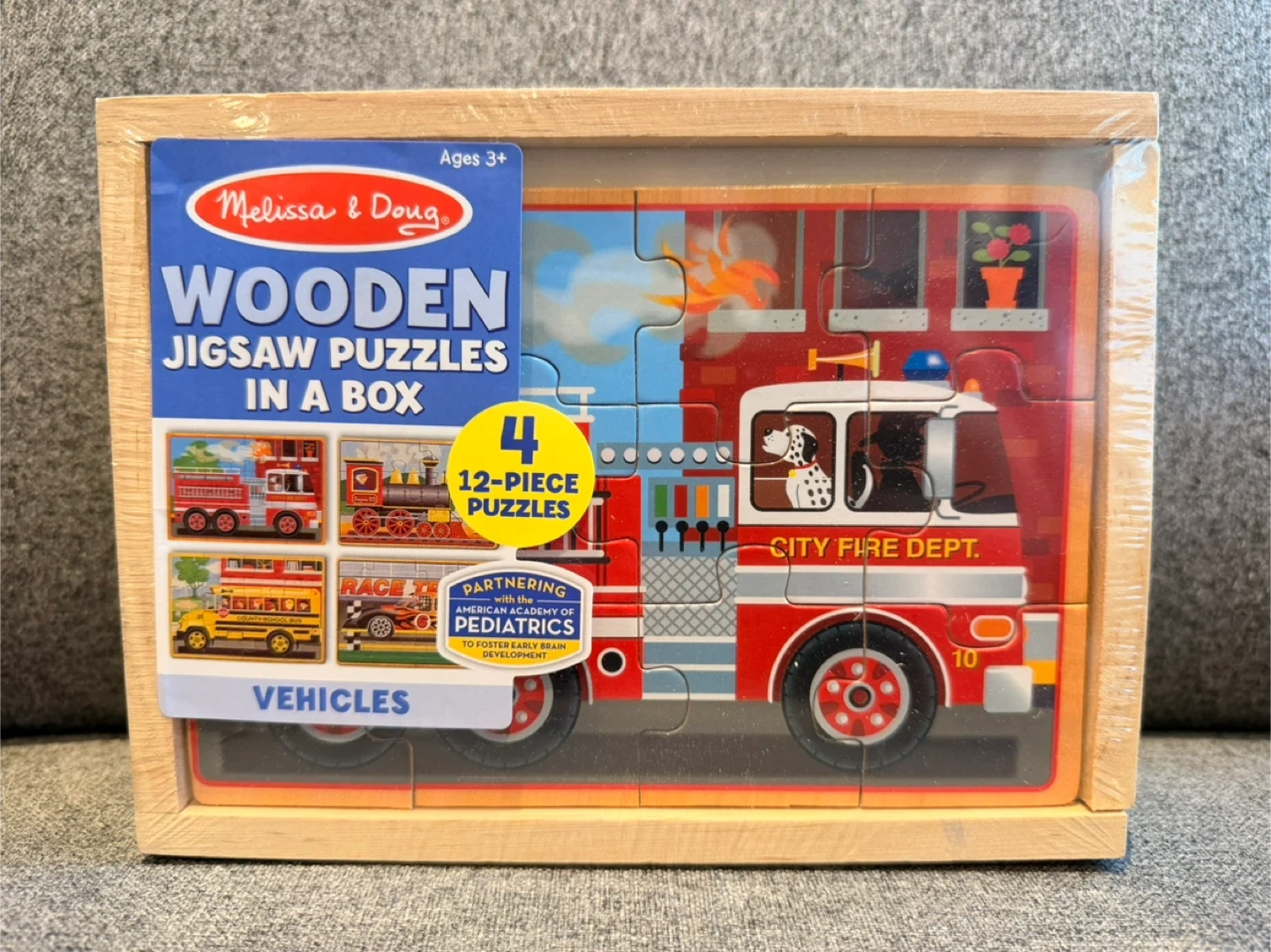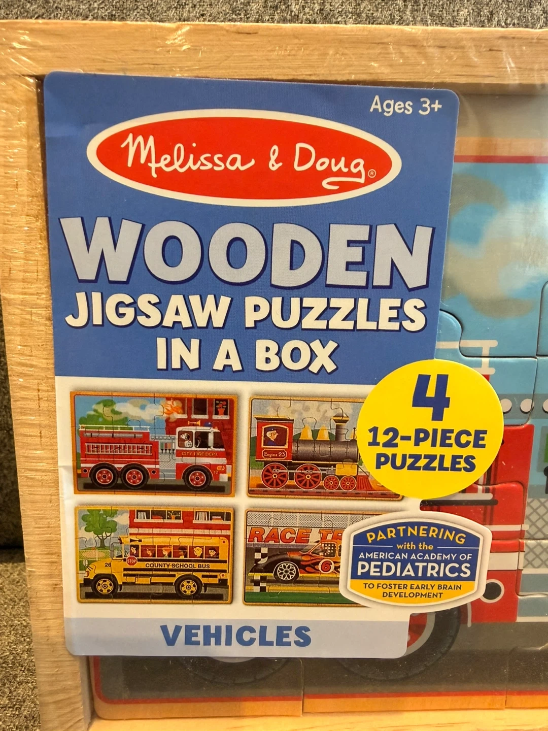 Brand New Melissa & Doug Wooden Jigsaw Puzzles in a Box - Vehicles I'm selling a brand new Melissa & Doug Wooden Jigsaw Puzzles in a Box, featuring a fun vehicles theme! It includes four 12-piece puzzles, each coded for easy sorting. The set is designed for ages 3+ and comes in its original wooden box. Perfect for developing sorting skills and telling transportation stories! Clean, smoke free home Pick up in North Ajax