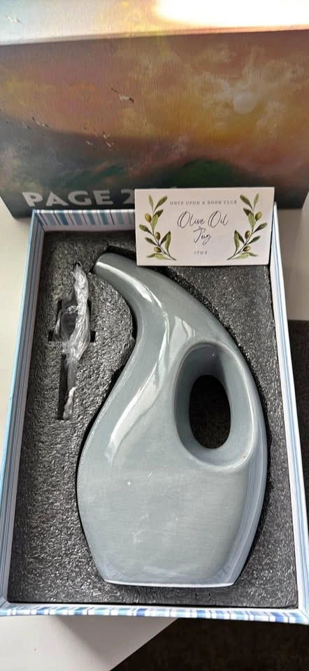 Another book club that I belong to is once upon a book club and they send gifts with the monthly subscription and this particular gift was a olive oil jug 17 ounces. It is brand new never been used and comes in a box.