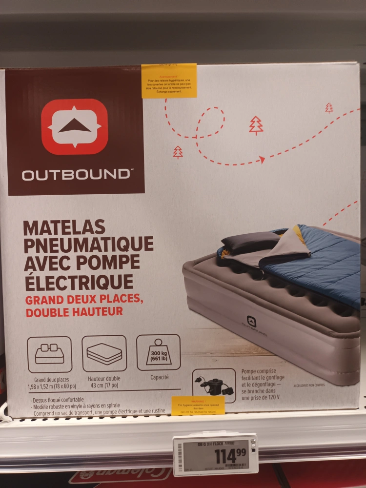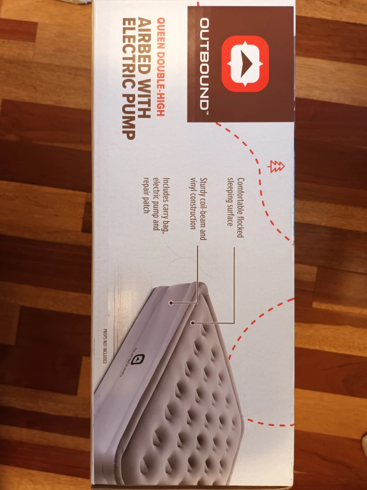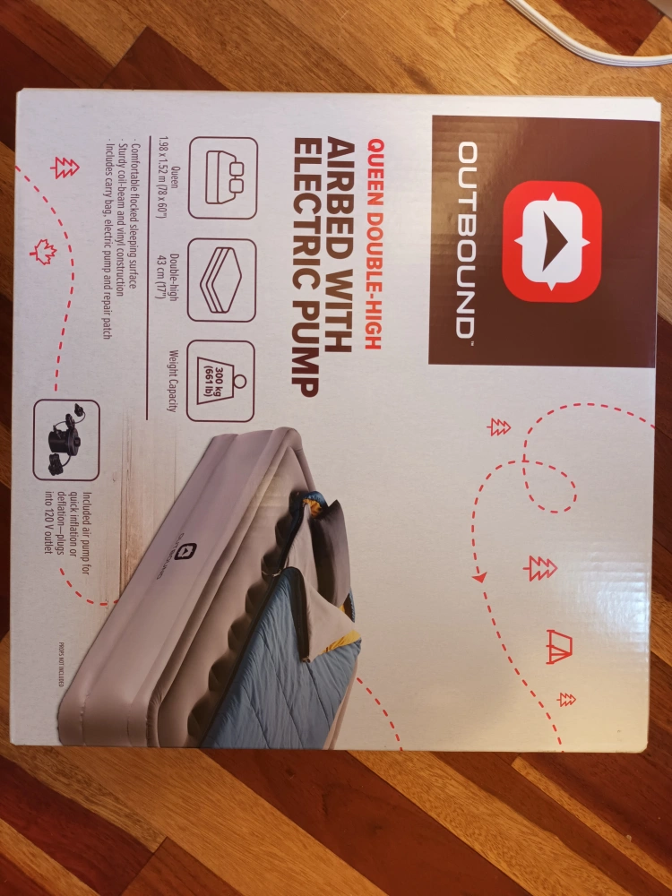Brand new, never used. Selling an Outbound queen double-high airbed with electric pump. It has a comfortable flocked sleeping surface and sturdy coil-beam and vinyl construction. It also includes a carry bag and a repair patch. Includes air pump for quick inflation—plugs into 120V outlet