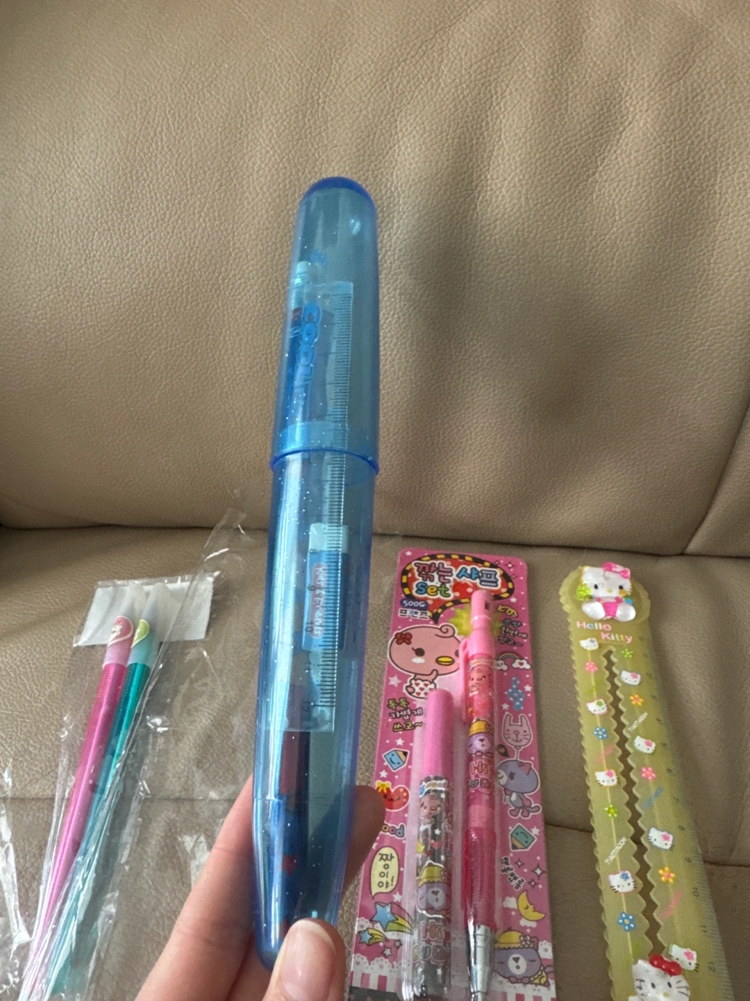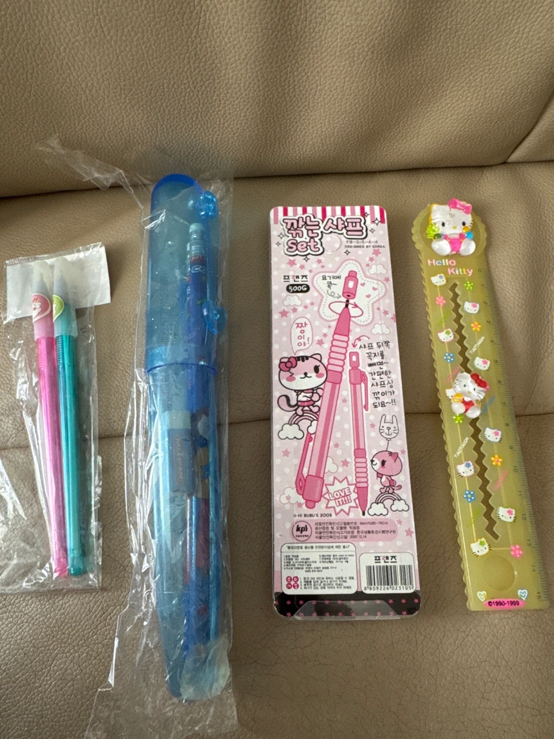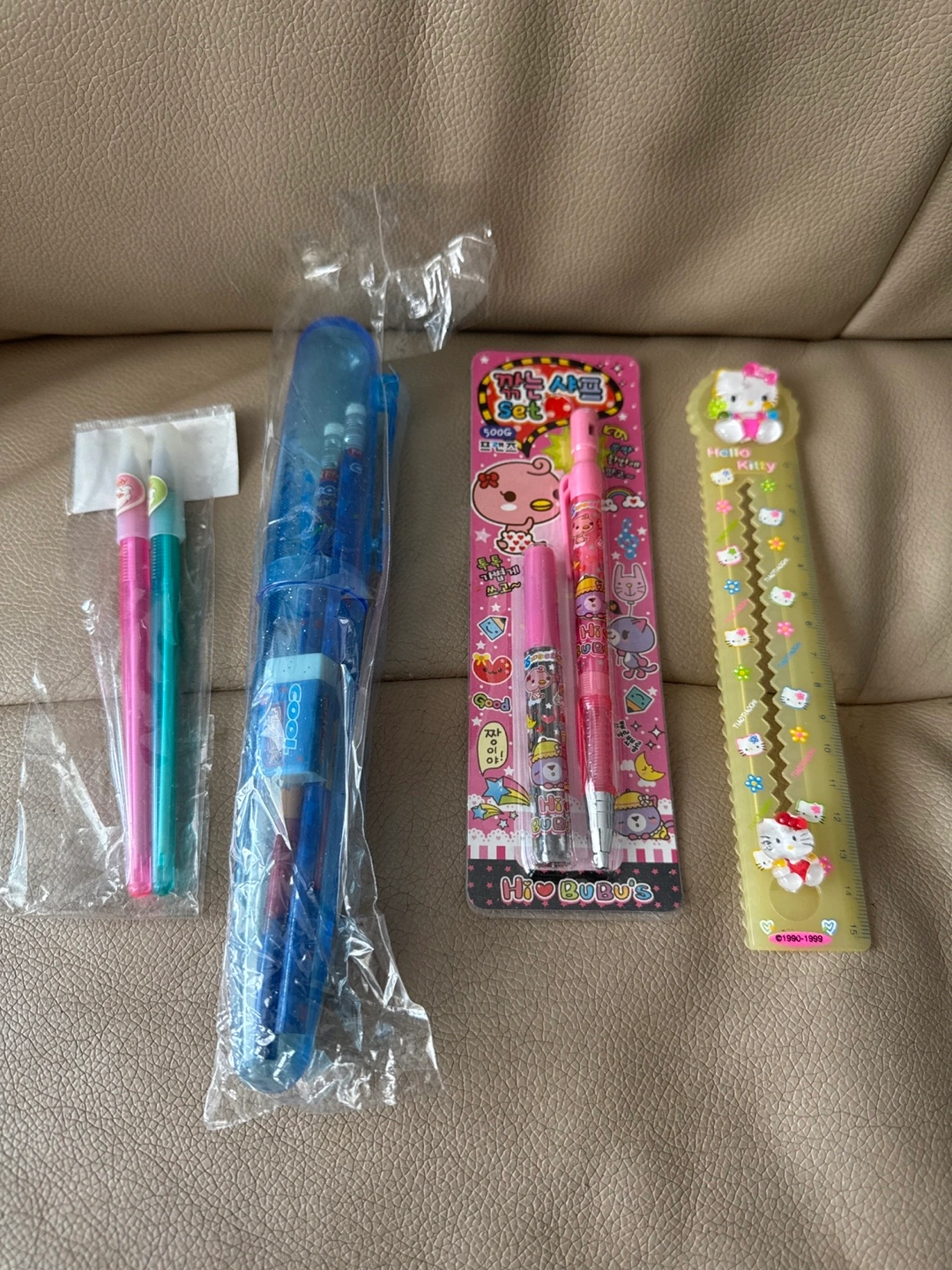 Brand new stationary! Take all for $10 Set of 2 blue pens Blue pen set (has a ruler, eraser, and 2 pencils) Mechanical pencil set Hello kitty ruler