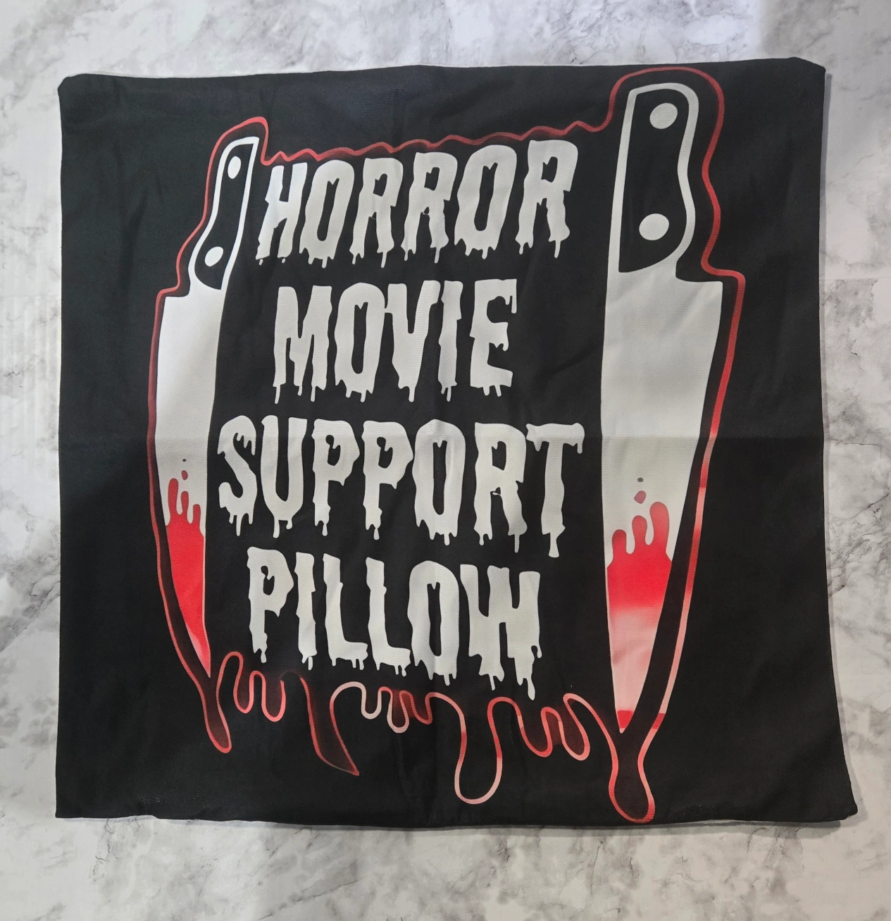 This black pillow has a fun design for horror movie fans! It says 'Horror Movie Support Pillow' with knife graphics on either side (Everything we sell is brand new)