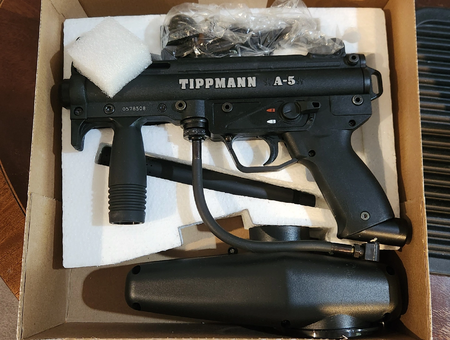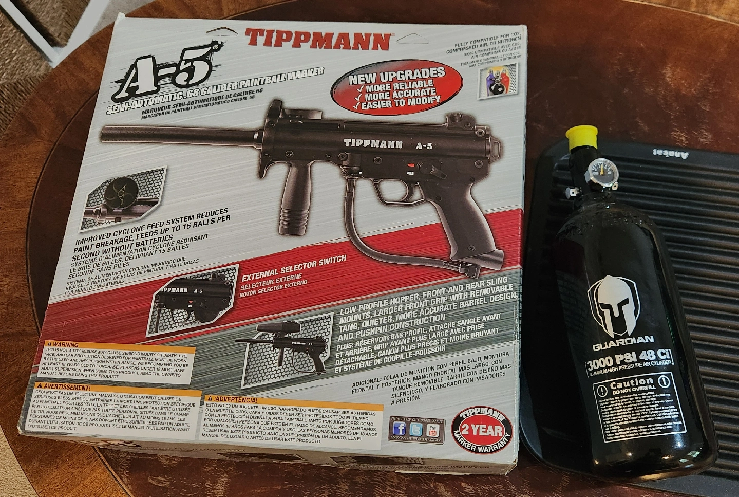 Selling a BRAND NEW Tippmann A-5 .68 caliber paintball marker. It's in the original box. Also included is a Guardian 3000 PSI 48 CI aluminum high-pressure air cylinder. Ready for some paintball fun! pick up in Langley or Richmond