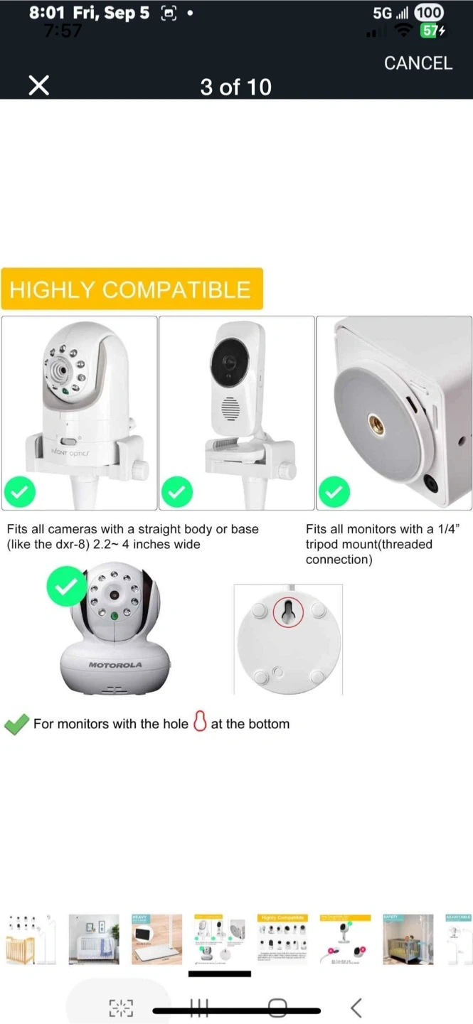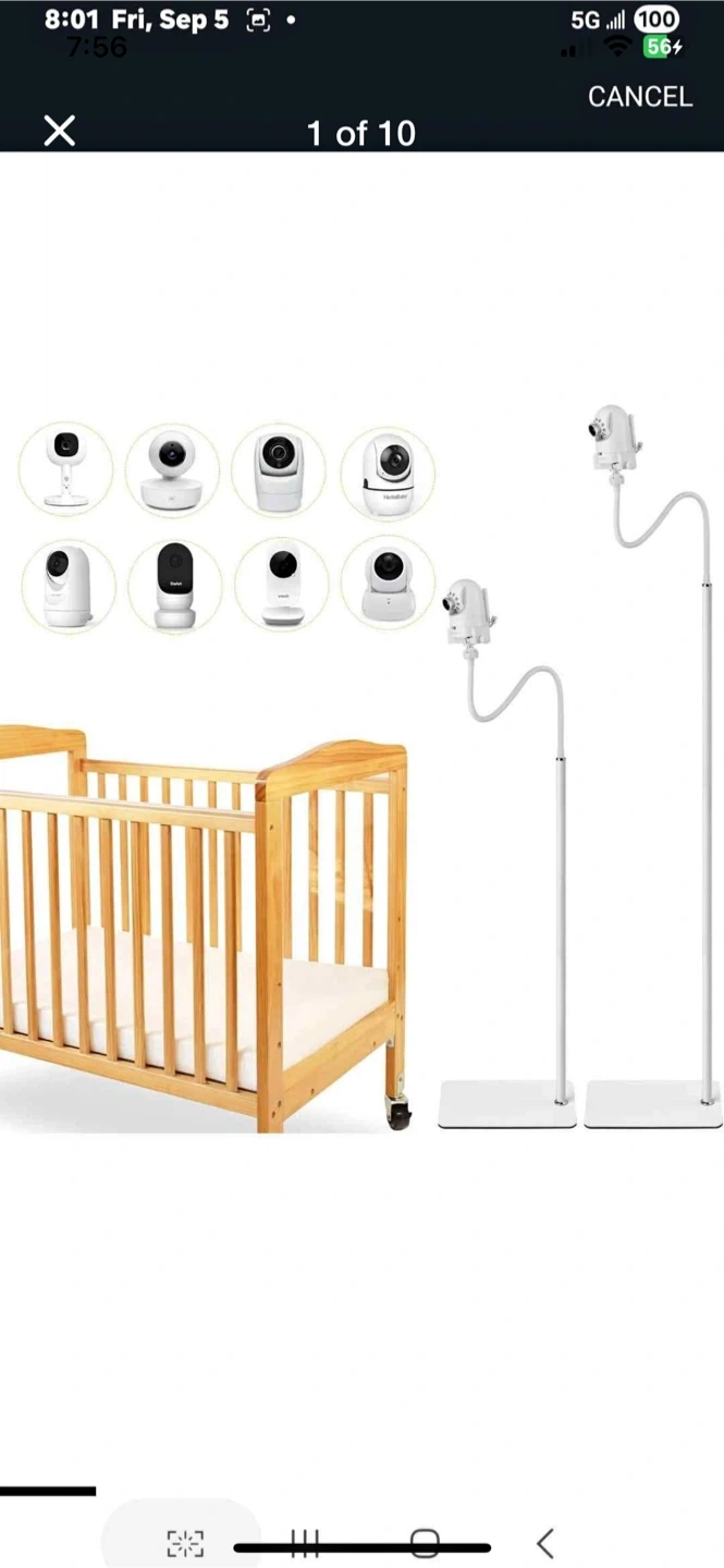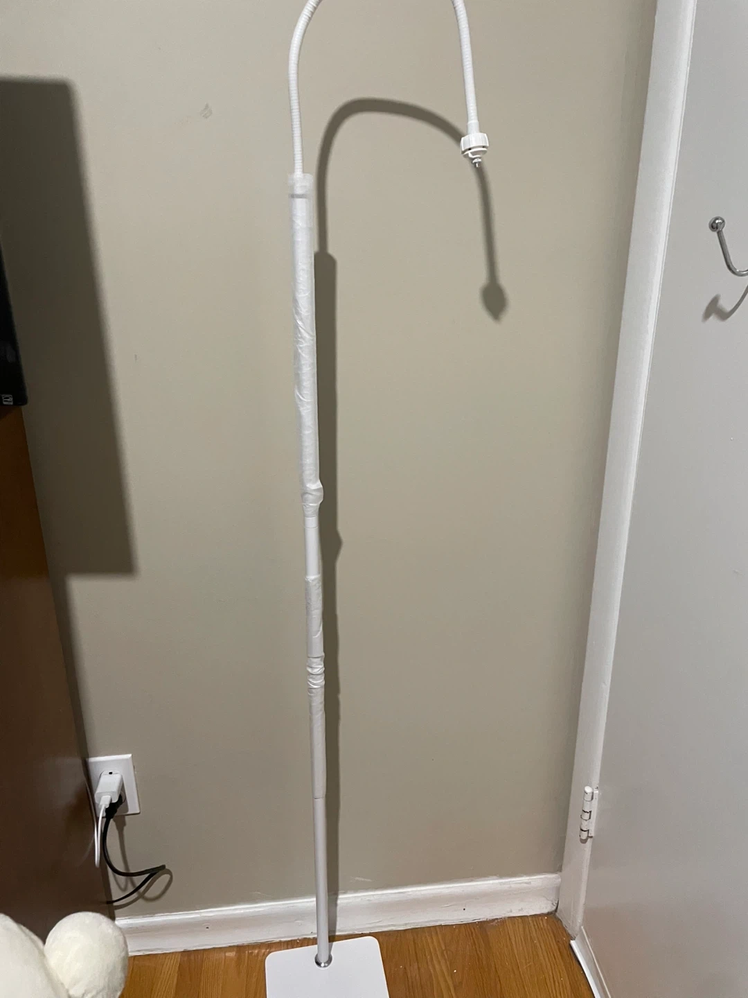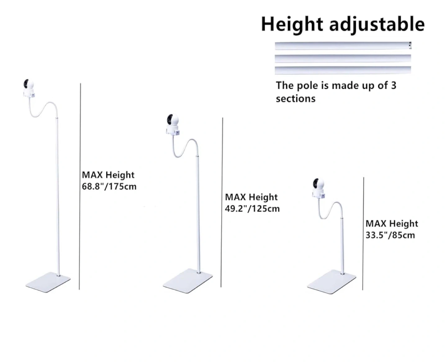 Selling a white floor stand mount for a baby monitor. It features: - A sturdy base - Is height adjustable - The pole is made up of 3 sections Max height is 68.8"/175cm.