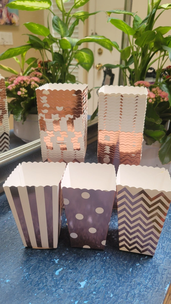 A set of high quality popcorn or treat boxes with assorted designs! Great for parties, movie nights at home, birthday, wedding etc. They come in a variety of patterns including stripes, polka dots, and zigzags size 3x3x4.75 height in inches