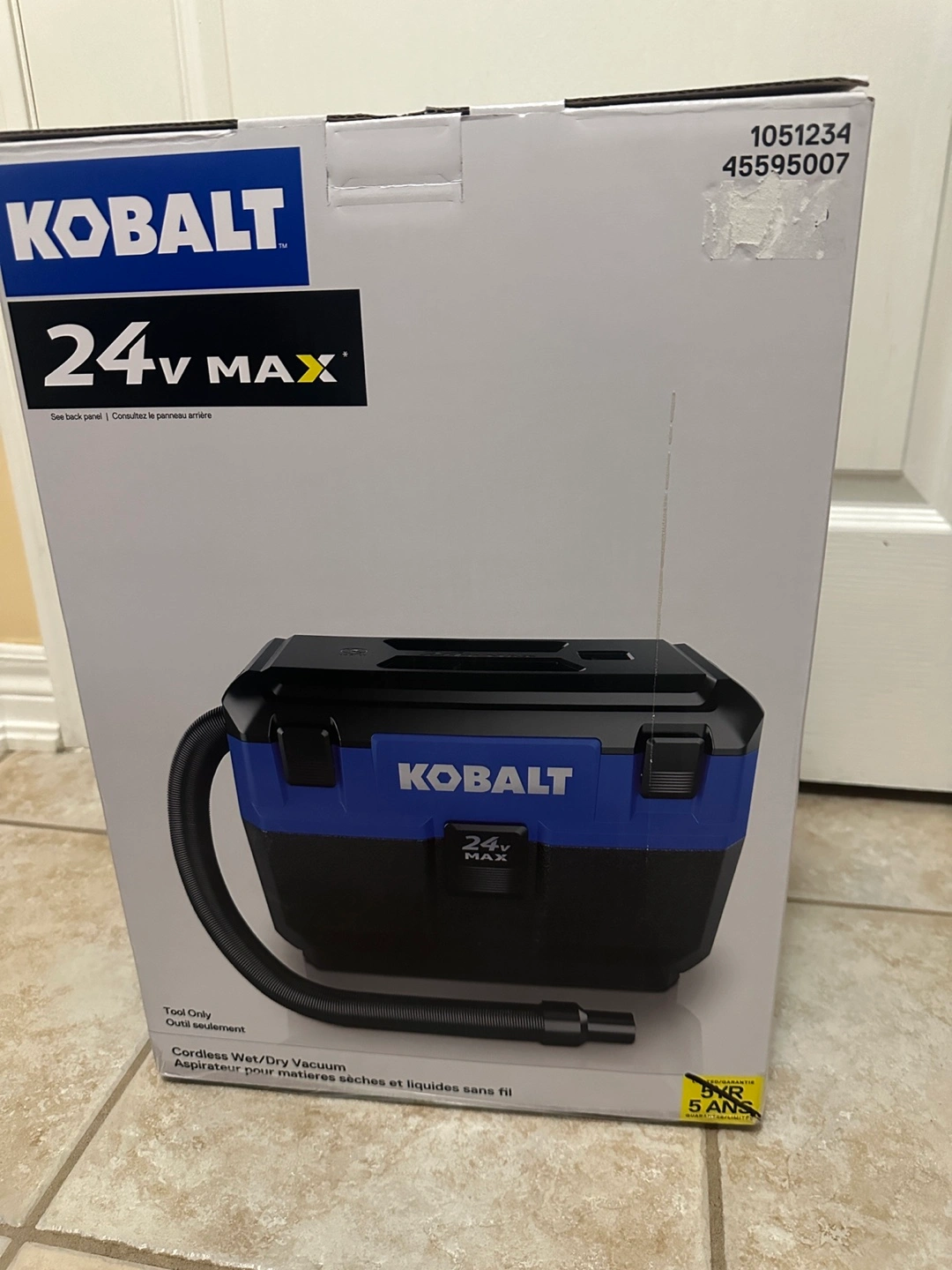 Mississauga Brandnew Kobalt 24-V Max Cordless Handheld Wet/Dry Shop Vacuum - HEPA Filter - Bare Tool without Battery $130 Powerful motor produces air volume of up to 50 CFM and water lift of 38-in Accessories included: 7-ft hose (1-1/4-in diameter), crevice tool,floor tool High-efficiency washable HEPA filter traps 99.7% of dust as fine as 0.3 microns Convenient top compartment to easily store and transport your accessories and battery Easy-open latches, on bottom debris and water canister, makes it easy to empty Compatible with all Kobalt 24-volt max batteries and chargers (sold separately)