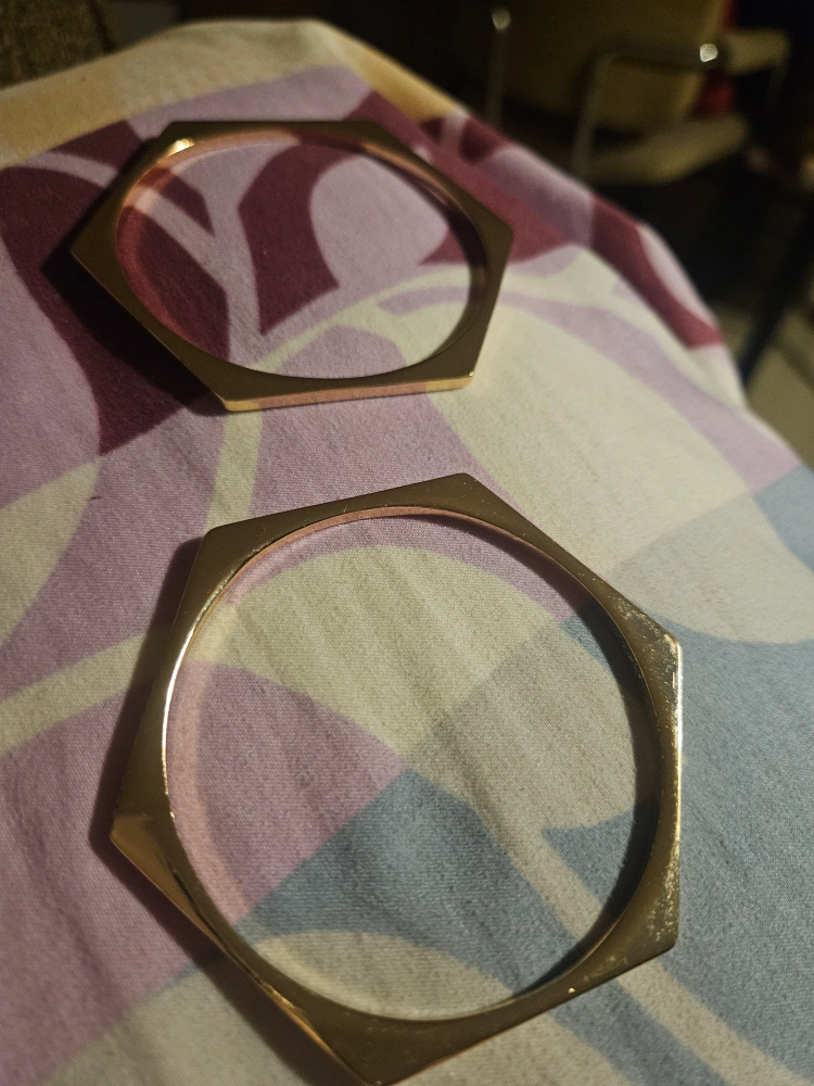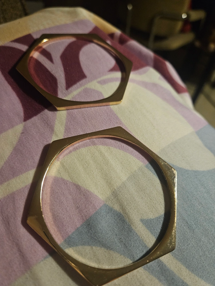 Selling a set of two stylish Brass hexagon bangle bracelets! They're in great condition and perfect for adding a touch of modern flair to any outfit