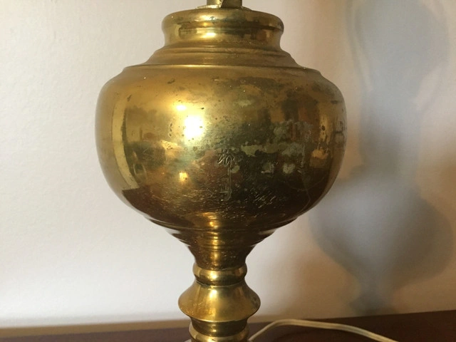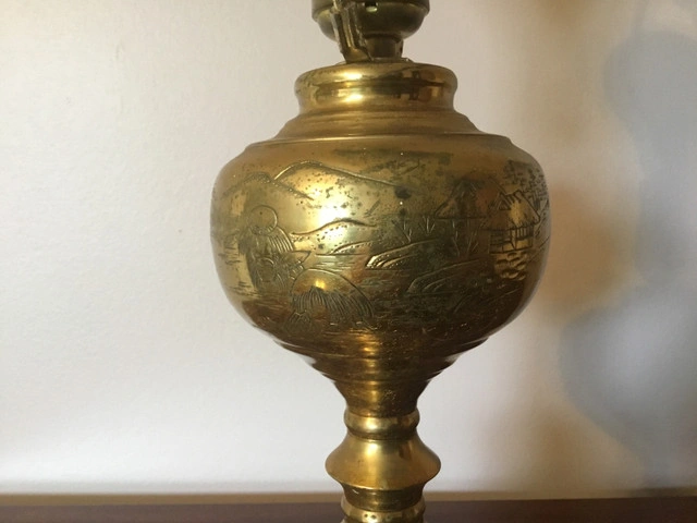 Engraved brass table lamp measures 18”H. Pickup in the Cawthra and Rathburn area in Mississauga.