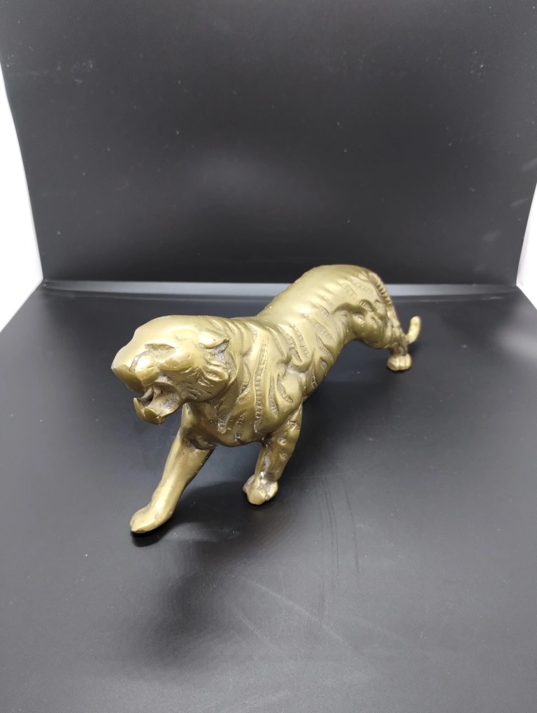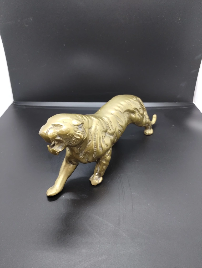 Small brass tiger statue. Intricate detailing. Great for collectors or home décor. Looks vintage.