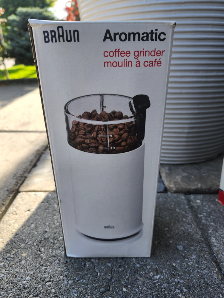 Selling a Braun Aromatic KSM 2 coffee grinder! It has a capacity of 2.5 oz (up to 12 cups of coffee). It also features a safety switch and cord storage for easy use and tidiness. The lid is graduated for precise measurement. Get ready to enjoy freshly ground coffee at home
