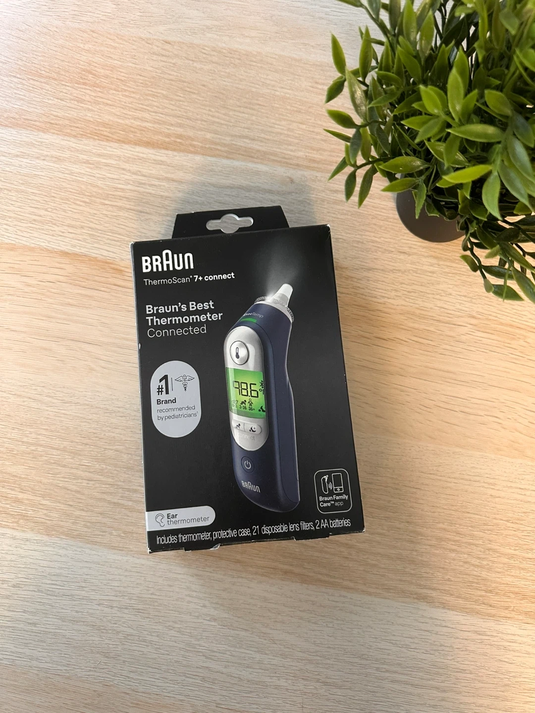 Selling a brand new Braun ThermoScan 7+ Connect Thermometer! It's Braun's best connected thermometer. Key features include: - Braun FamilyCare app to track symptoms - Age Precision technology for fever guidance - Clinically proven accuracy, even in newborns - ExacTemp stability indicator - Soft light and silent mode - Hygienic lens filters Includes the thermometer, a protective case, 21 disposable lens filters, and 2 AA batteries