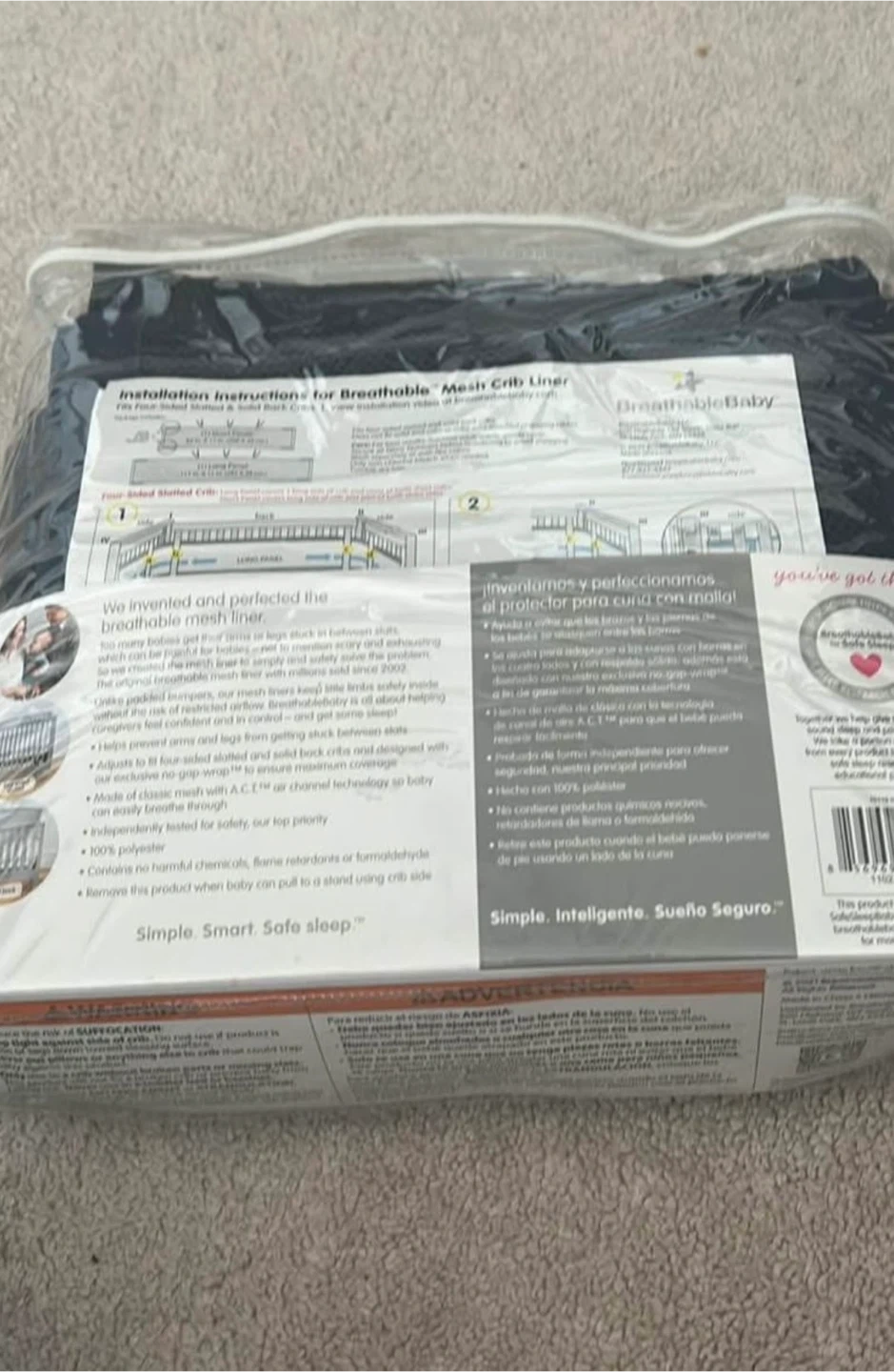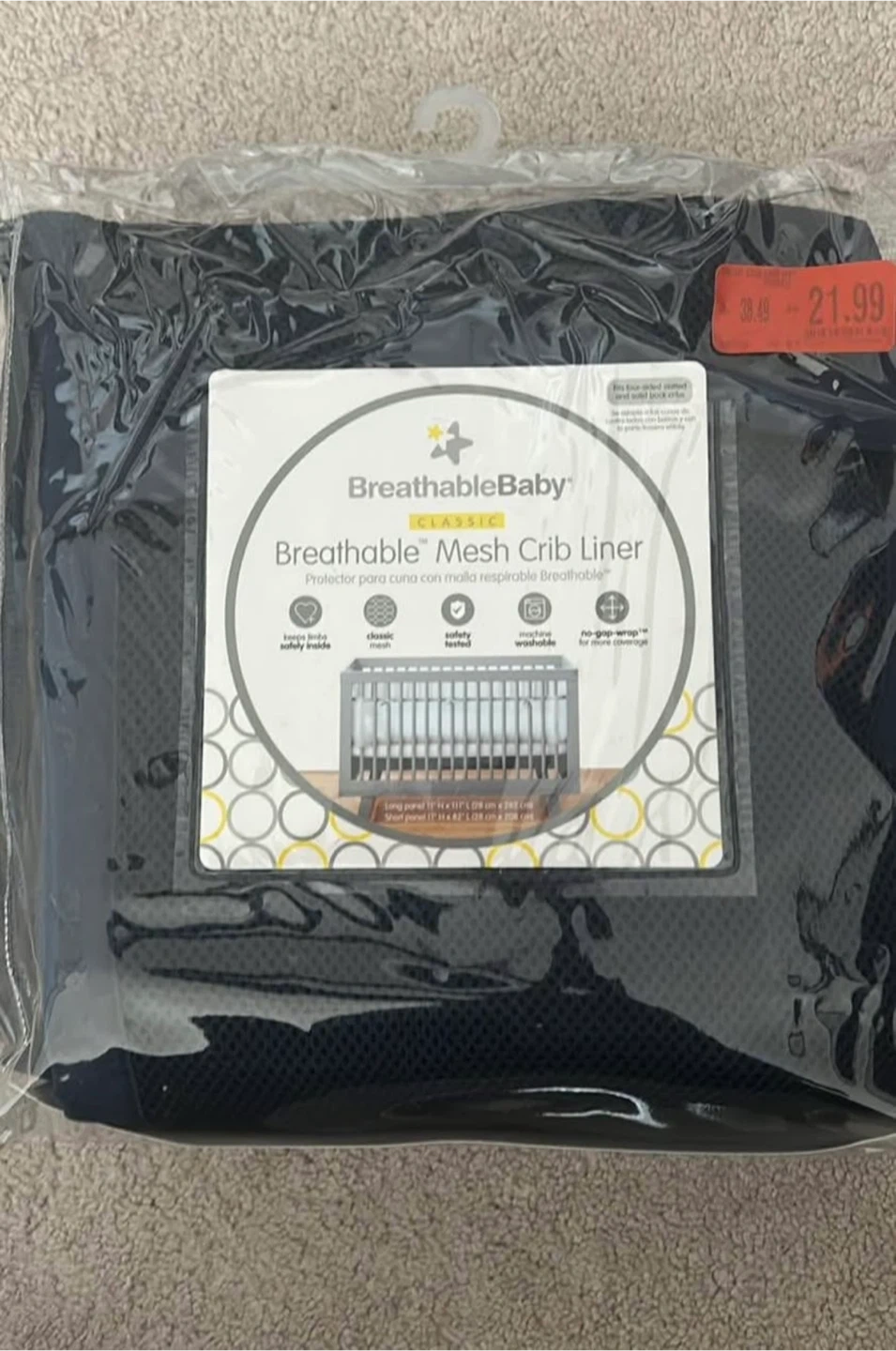 Selling a brand new BreathableBaby Classic Breathable Mesh Crib Liner! This liner is designed to promote safety and airflow within the crib. It's made of 100% polyester and is free of harmful chemicals, flame retardants, or formaldehyde. It's designed to fit four-sided slatted and solid back cribs.