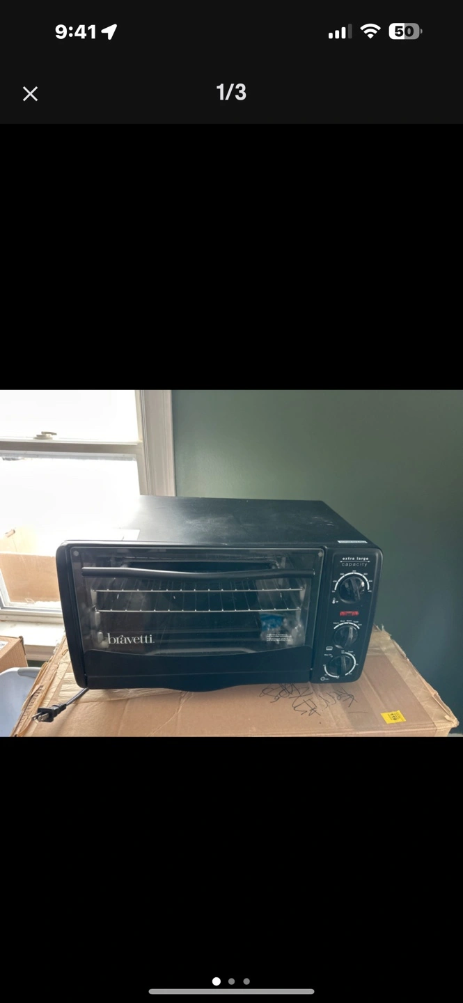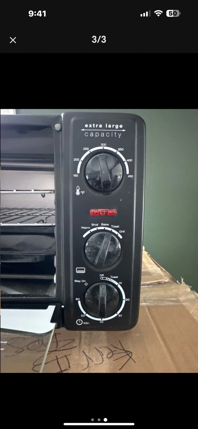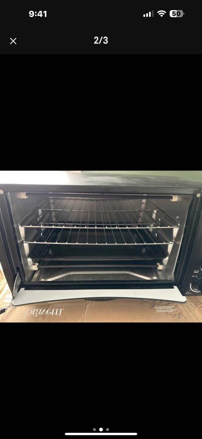 Black countertop oven. Extra large capacity. Includes racks and baking pan. Multiple functions: bake, broil, toast, and grill. Timer and temperature controls. Works perfectly