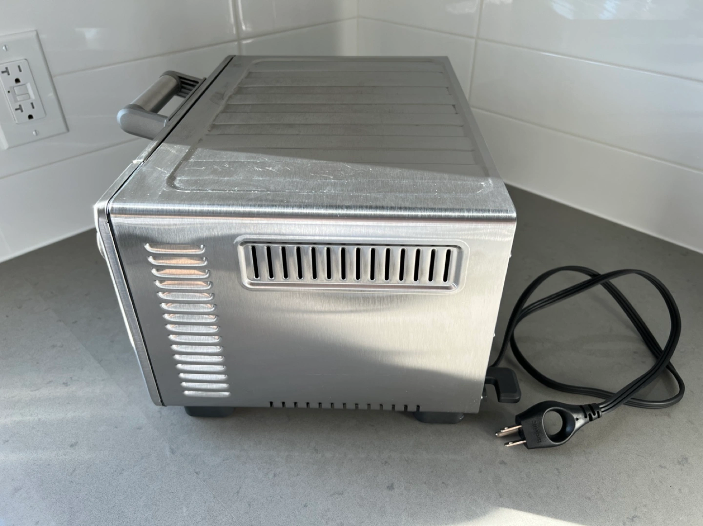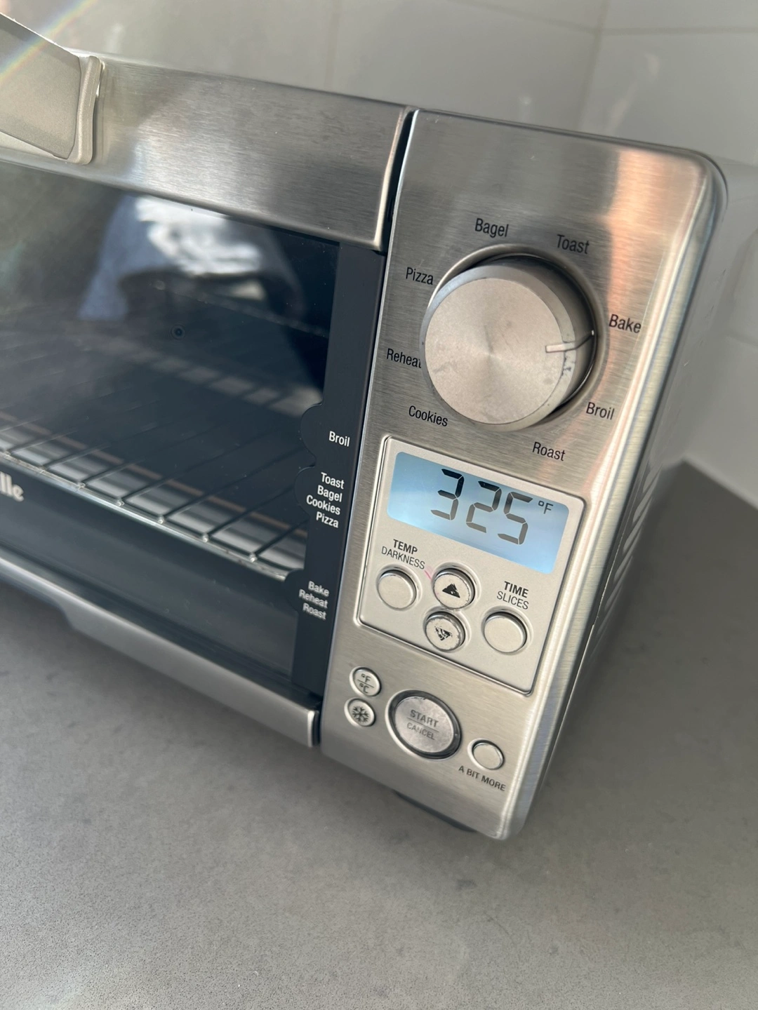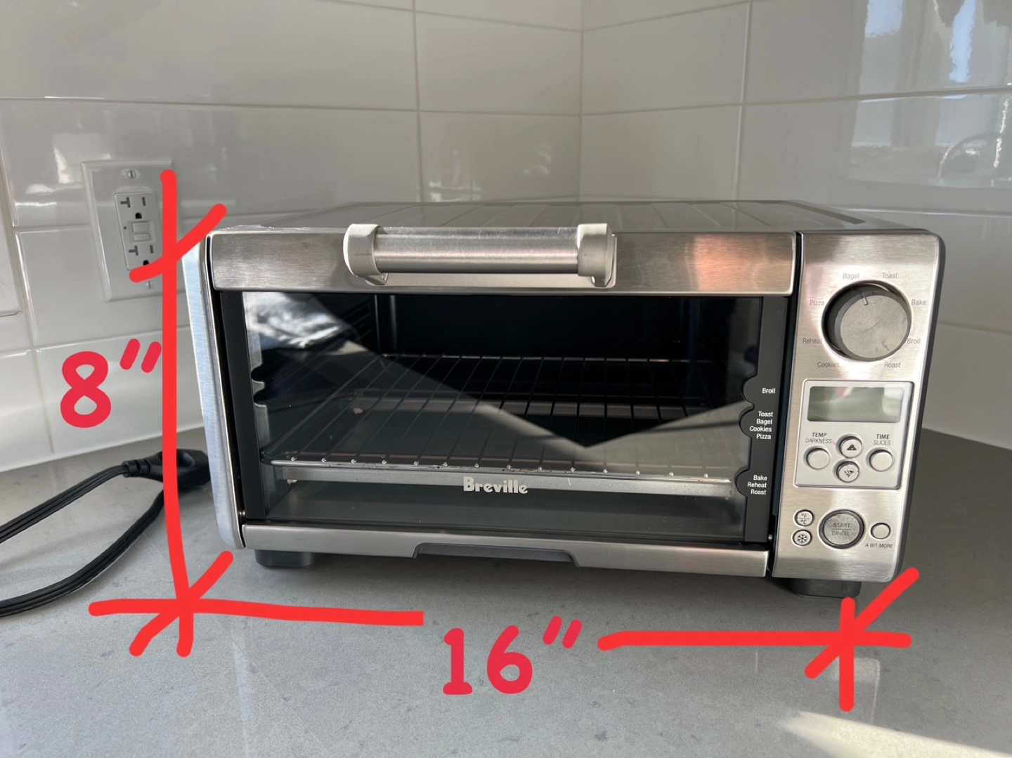 Stainless steel mini smart oven. Multiple functions: bake, broil, toast, bagel, pizza, reheat, and cookies. Digital controls and timer. Fully functioning but with some baked on grease. See photos for details.