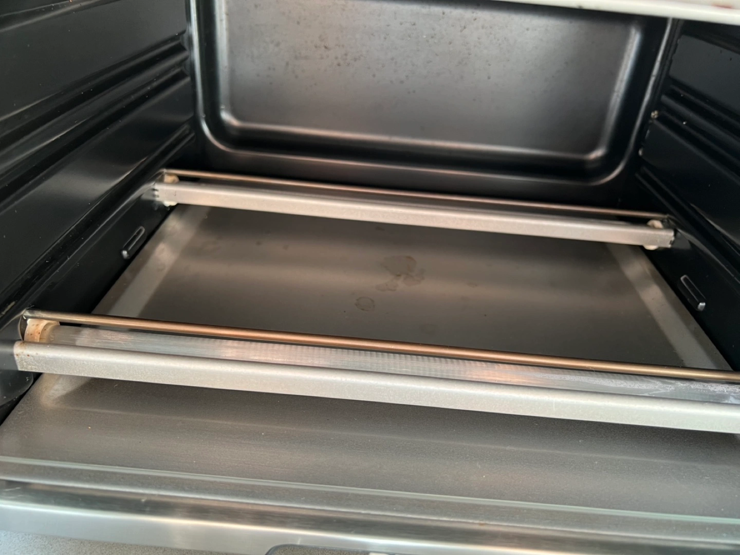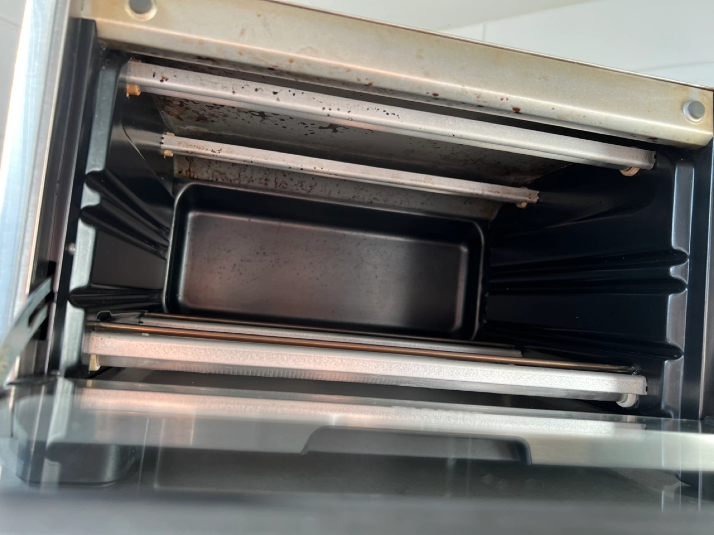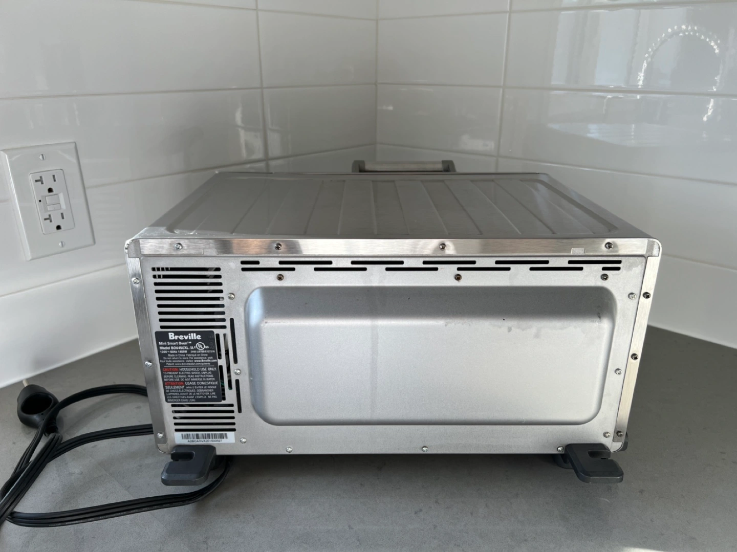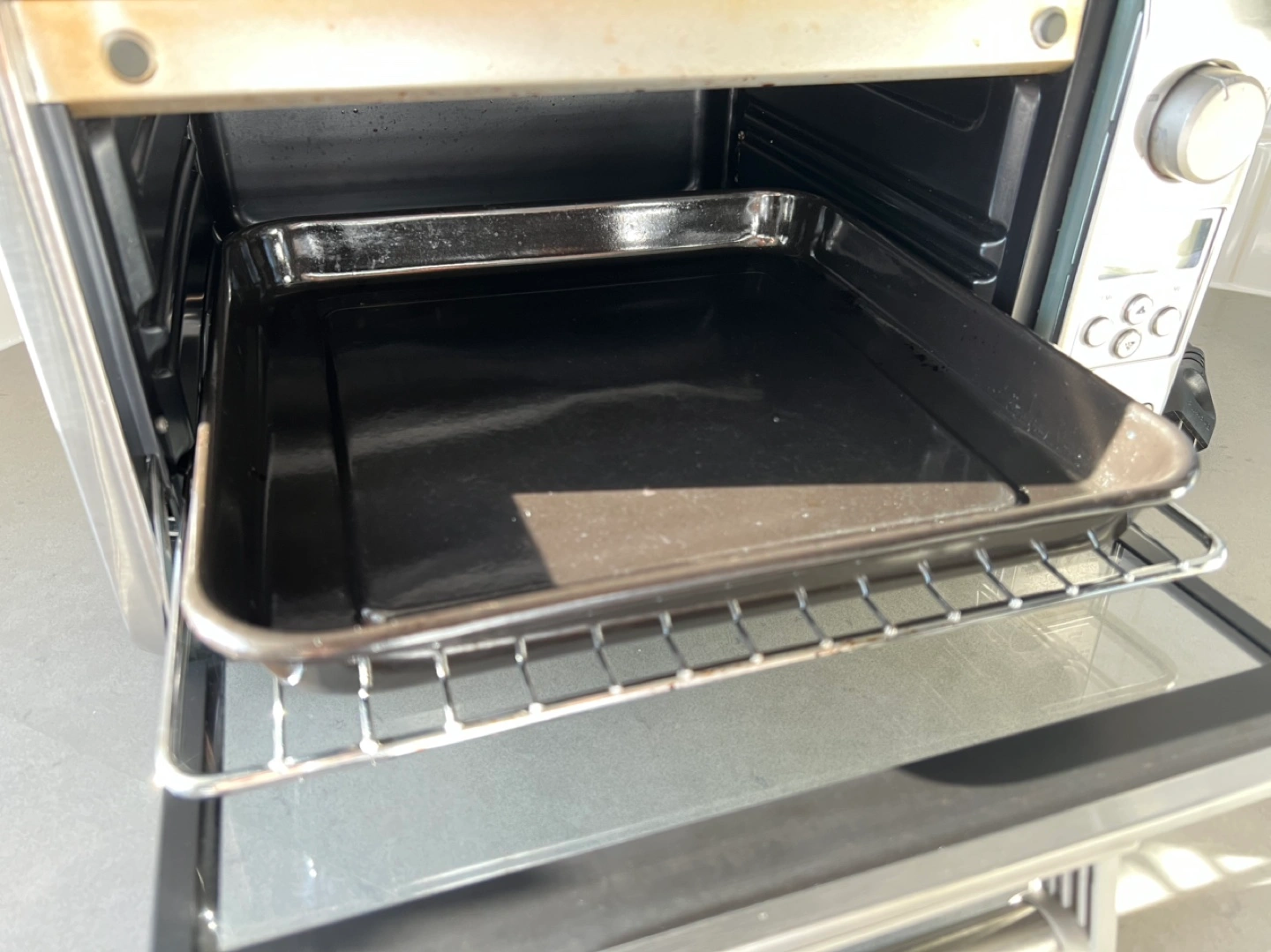 Stainless steel mini smart oven. Multiple functions: bake, broil, toast, bagel, pizza, reheat, and cookies. Digital controls and timer. Fully functioning but with some baked on grease. See photos for details.